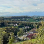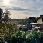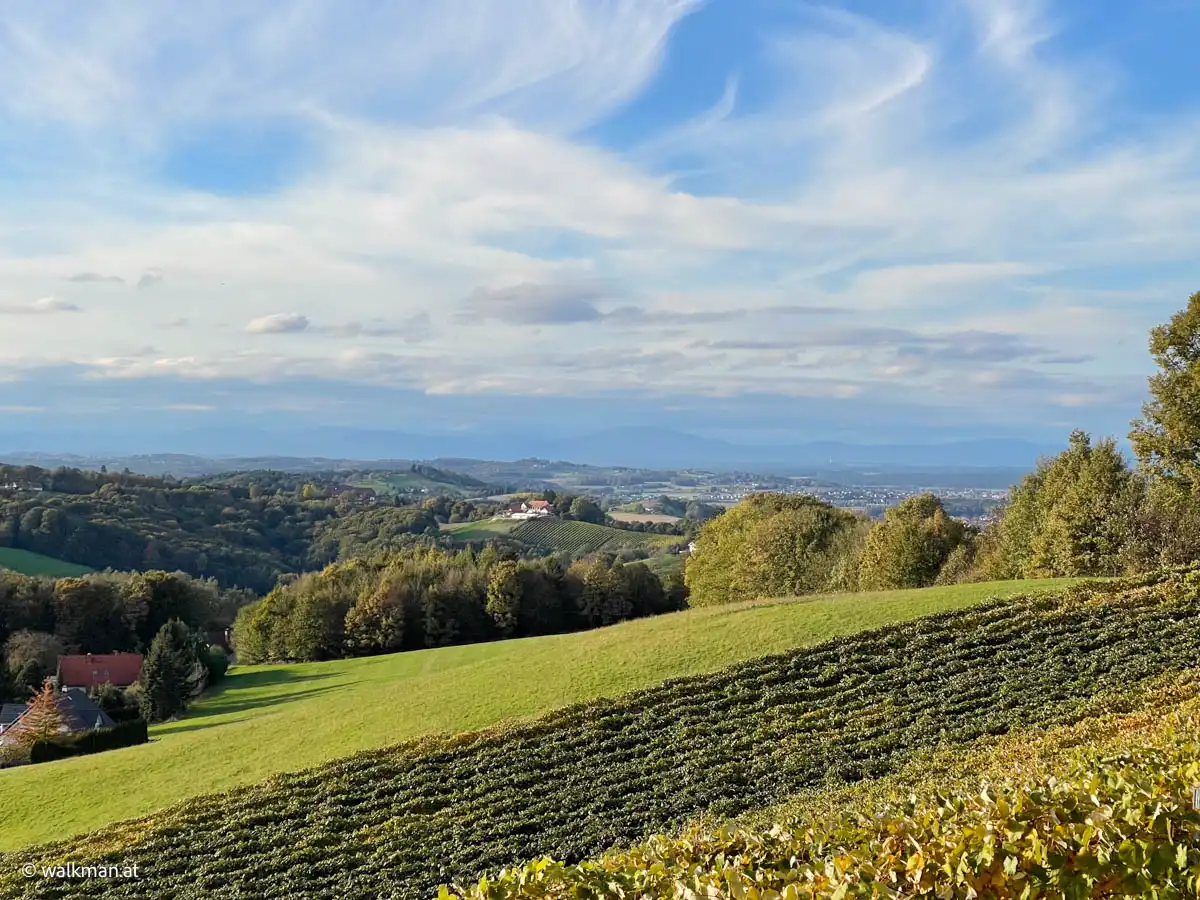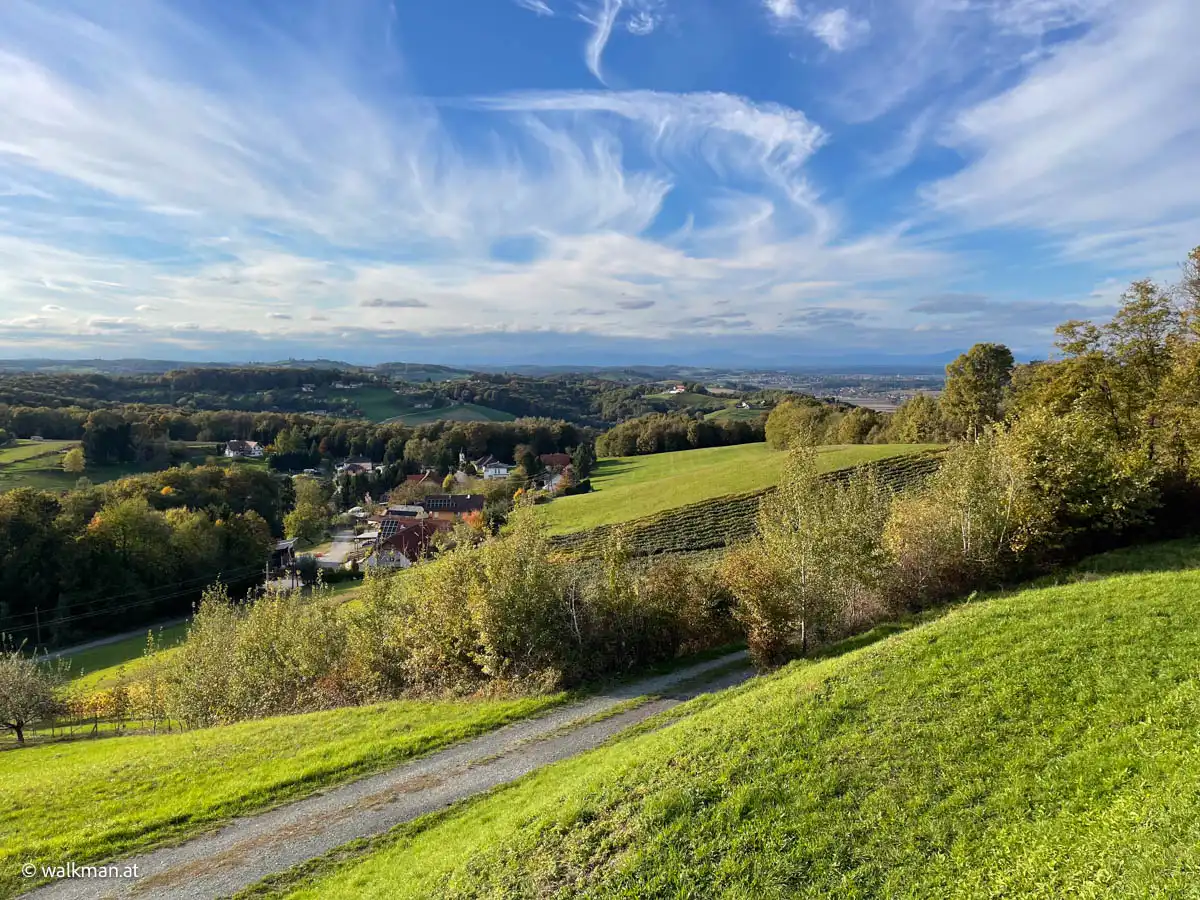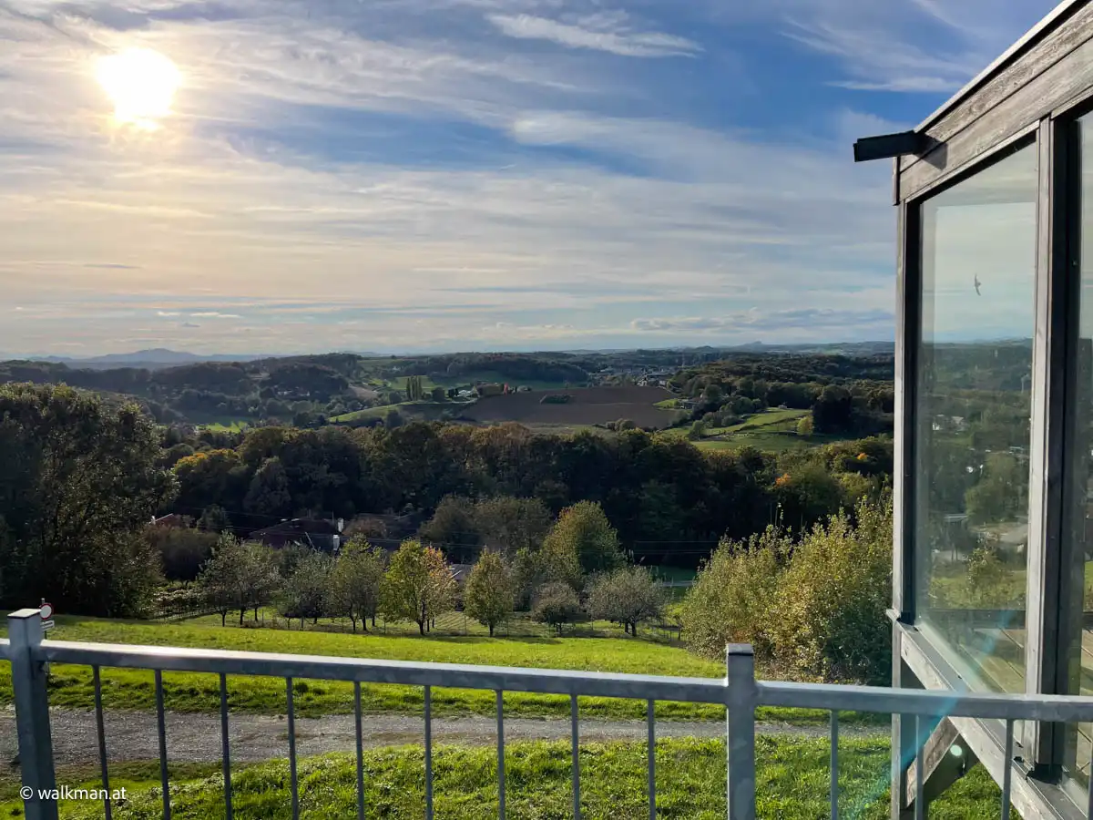 Die Aussicht ist auch hier, nach wie vor, noch genial. Im Nordwesten kann ich einen Ort erkennen. Ob das Fürstenfeld ist? Ich weiß es nicht. Wohl eher Bad Loipersdorf. Zumindest sagt mir das ein nachträglicher Blick auf die Karte, als ich den Artikel hier schreibe. Recherche ist eben alles.