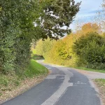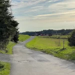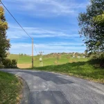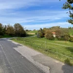 Nach dem anfänglichen, eher mit Häusern verbauten Teil, spaziere ich nun auf einen weitgehend unverbauten Abschnitt dahin. Mit tollem Panoramablick ins Tal nach Süden. Ein erster Vorgeschmack. Auch begegne ich weiteren „Outdoor-Wütigen“. Ein Pärchen, das sichtlich auch das eigentlich schöne Wetter genießt und dem Herbstwind trotzt, unterhält sich am Straßenrand angeregt mit einem weiteren, offensichtlich einem Haus hier zugehörigen, Zweiergespann.