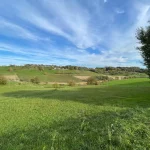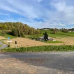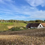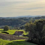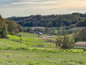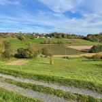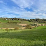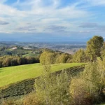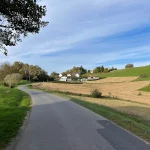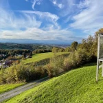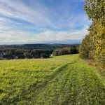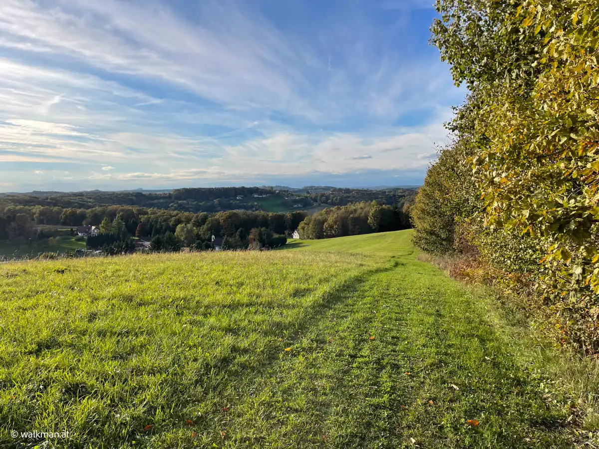 Wir grüßen einander freundlich. So soll’s sein. Nun wandere ich, wieder leicht bergauf, in ein Waldstück hinein. Hier beschreibt meine Route nun eine scharfe Wende nach links. Und gleich wieder mal bergab. Aus dem Wald heraus tretend, liegt das nächste Panorama vor mir. Ja, die Gegend hier ist wirklich schön.