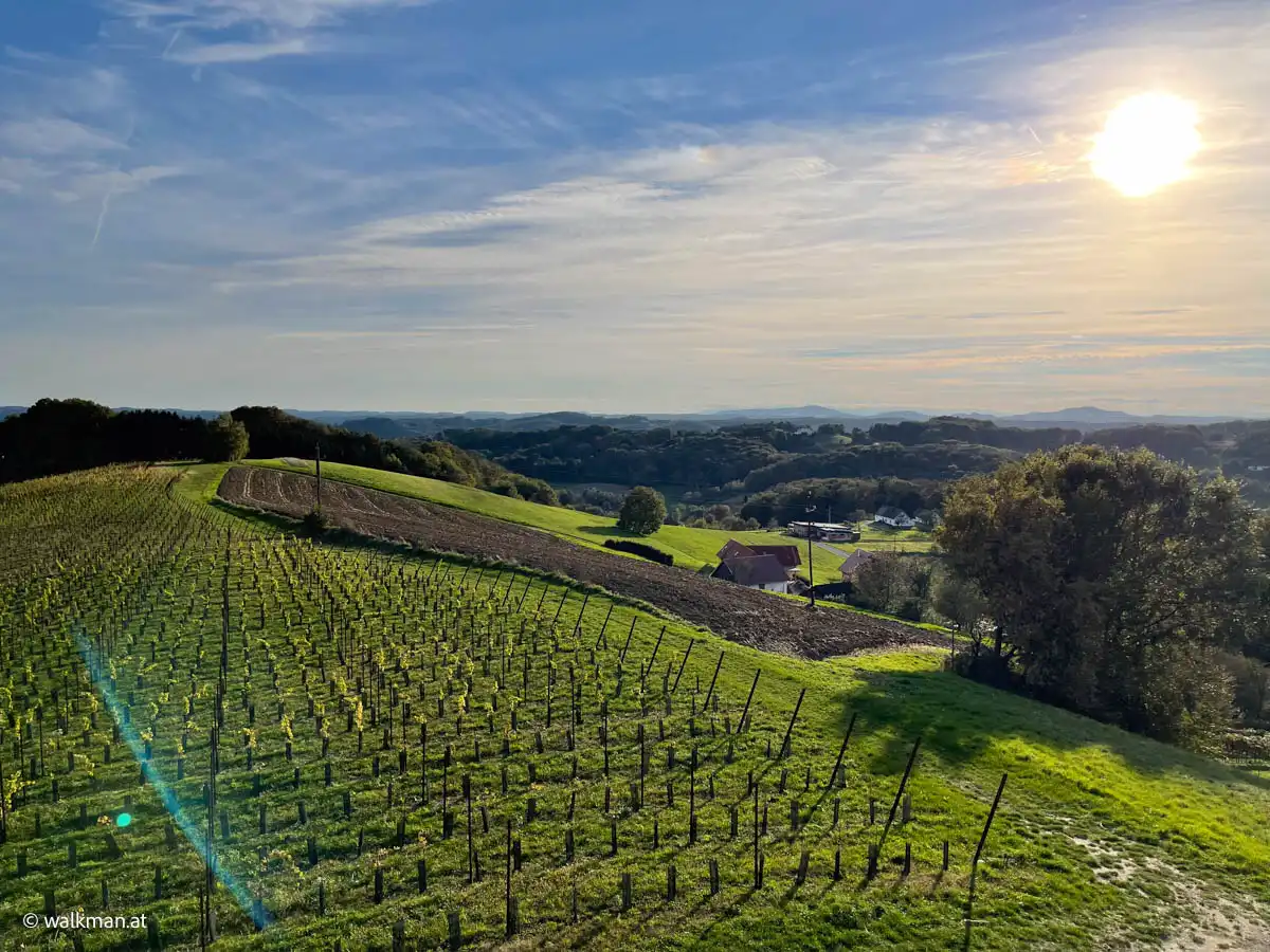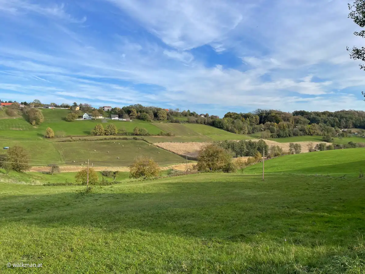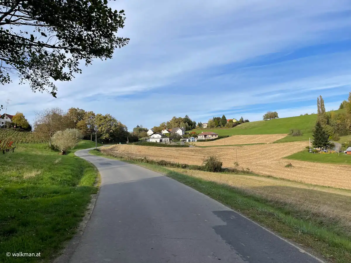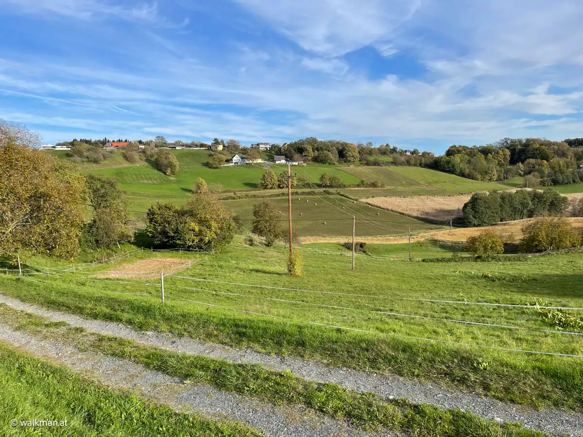 Eine Mischung aus Wiesen und Wald. Unterbrochen von vereinzelt angelegten Weingärten. Und dazwischen hier und dort mal ein Haus. Oder eine Streusiedlung. Richtig typisch Südburgenland. Wobei, eher typisch Süd-Südburgenland. Weil hier sind die Hügel nicht mehr so sanft, wie beispielsweise im Güssinger Bezirk. Hier geht’s schon ein wenig ins „Steirische“. Herrlich.