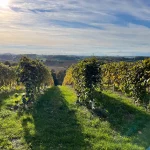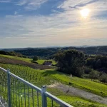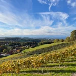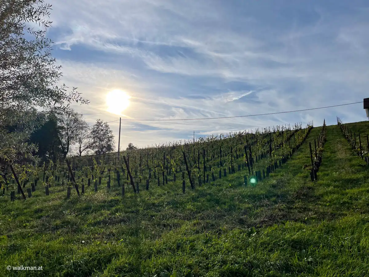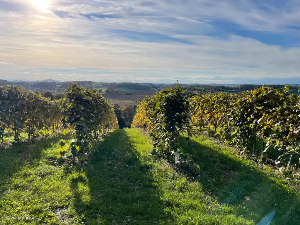 Nach dem Wald heißt hier auch vor den Weingärten. Ich trete aus dem Wald heraus und finde mich quasi zwischen Weinreben wieder. Zwar, ob des Maschendrahtzaunes zwischen mir und den Reben, nicht ganz, aber so wär es sinngemäß zu beschreiben. Und zwischen den Weinreben eine schöne Aussicht ins Tal.