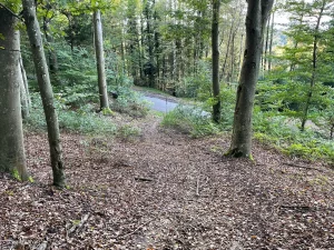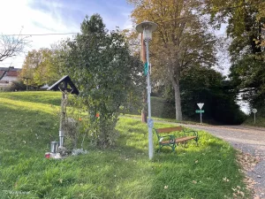 Parkmöglichkeiten sind hier tatsächlich Mangelware. Zumindest bei meiner abgesteckten, etwa 3 Kilometer langen, Runde. Also bleibt hier nur die Option „Straßenrand“. Was hier, im einerseits hügeligen und andererseits relativ dicht bebauten, Teil des Bezirks aber auch nicht so einfach ist. Fündig wurde ich dann aber bei einer Kapelle. Hier konnte ich mein Vehikel, auf einem Streifen zwischen Straße und Wald, gerade noch so reinzwängen.