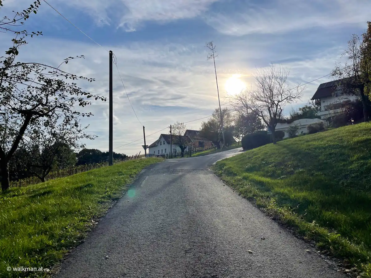 Ganz so „frisch und saftig“ wie die steirischen Äpfel ja oft beworben werden, bin ich selbst aber heute nicht mehr. Obwohl ich erst knappe 20 Minuten unterwegs bin, fröstelt es mich bereits ein wenig. Die hügelige Runde brachte mich ins Schwitzen und der frische Herbstwind sorgte dafür, dass der Schweiß auf meiner Haut alsbald wieder erkaltete. Mein winterlicher Anorak wird demnächst ausgepackt. Das nehme ich mir vor.