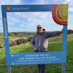 Und die Aussicht? Genial. In alle Himmelsrichtungen, so weit das Auge reicht. Einzig hinter dem „Rasthäuschen“ – wenn man es so nennen mag – liegt eine Baumgruppe, welche die Sicht nach Norden etwas einschränkt. Aber sonst? Nichts zu beanstanden. Eine Aussichtswarte, wie sie sein muss. Und natürlich fehlt auch der, von vielen anderen Orten bereits bekannte, hellblaue „Burgenland-Fotorahmen“ nicht, der am Fuß der Warte auf die fotowütigen Touristen wartet.
