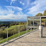 So verfügt die Warte sogar über einen, mit Plexiglas geschützten, überdachten Bereich. In dem auch eine Bank zum Rasten, mit Tisch steht. Aber das ist noch nicht alles. Auch das Konstrukt selbst ist modern und wirkt „trendy“. Eine langgezogene Plattform, an deren Ende auch ein Fernglas steht.