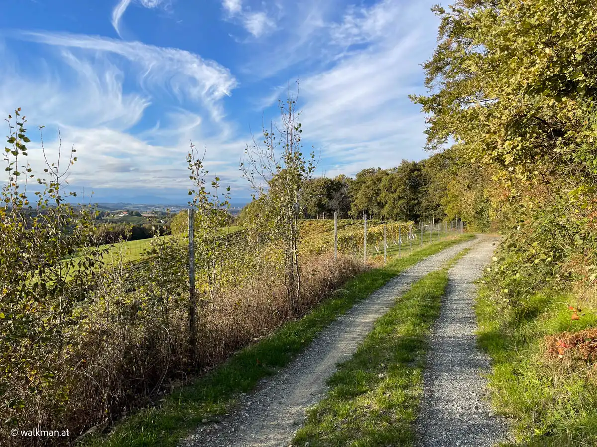 Von der Warte geht es ein Stück weit wieder den Weg zurück, auf dem ich gekommen war. Bis zur Schleife, wo ich zuvor aus dem Wald herauf getreten war. Hier halte ich mich nun links, zwischen Weingarten und Wald entlang, in Richtung Tal spazierend.
