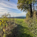 Aber ein paar halbwegs schöne Fotos sind es dann doch noch geworden. Weiter geht’s. Jetzt ein Stück weit bergauf. Dann wieder bergab. Ja, es ist hier unverkennbar hügelig. Zwischendurch ergattere ich auch mal einen Aussichtsblick. Aber die wirklich schöne Aussicht sollte ja bald folgen, auf der Warte.