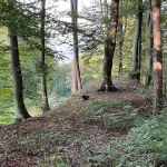 Nach dem Weingarten ein Stück weit über einen Wiesenweg und am Waldrand weiter entlang, muss ich dann direkt in den Wald hinein. Sowohl die Route am Handy, als auch ein hier prominent positioniertes Schild sind da einer Meinung. Der Blick auf das Handy verrät mir auch, das ich nicht mehr viel Strecke habe. Aber irgendwie bin ich noch viel zu hoch oben?!? Hm?!.