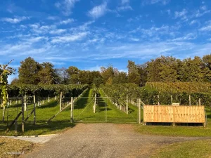 Den Anstieg hinauf stampfend trete ich bald darauf wieder aus dem Wald heraus und finde mich, am Waldrand, vor einem Weingarten wieder. Von der Umgebung im Tal sehe ich, ob der Weinstöcke aber nicht viel. Aber ich sehe ein geöffnetes Tor zum Weingarten. Natürlich gehe ich da rein. Schließlich muss ich gucken, ob man eventuell von der von außen erkennbaren, leichten Anhöhe, hier drinnen, mehr von der Gegend unten sieht.