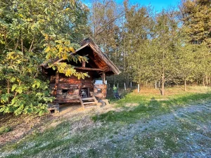 Aber nun bin ich, einige Fotos später, am Ende der Gasse angelangt und marschiere in den Wald hinein. Zumindest leiten mich die Schilder in diese Richtung. Weil, meine Route am Handy sagt etwas anderes. Die meint, ich müsse da, vor dem Wald, rechts hinauf. Dummerweise finde ich da aber keinen Weg. Was ich aber finde, ist ein neu errichtetes Kellerstöckl. Wo der Weg war.