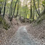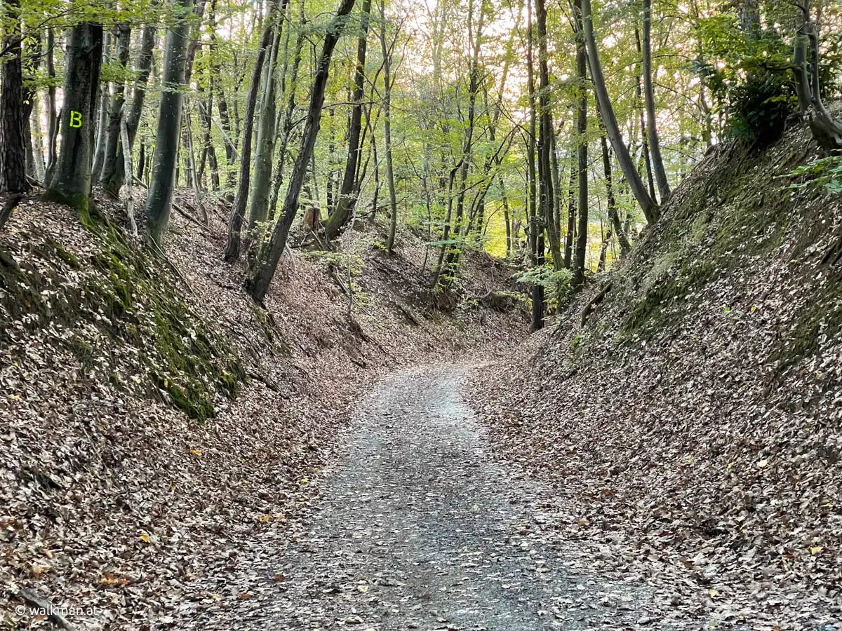 Nach den Weingärten führt die Route wieder ein Stück weit durch den Wald. Was mir auf diesem Abschnitt gut gefällt ist der tiefe Graben hier am Weg. Links und rechts stehen die Bäume etwa 3 bis 4 Meter höher und der Weg führt dazwischen, tiefer hindurch.