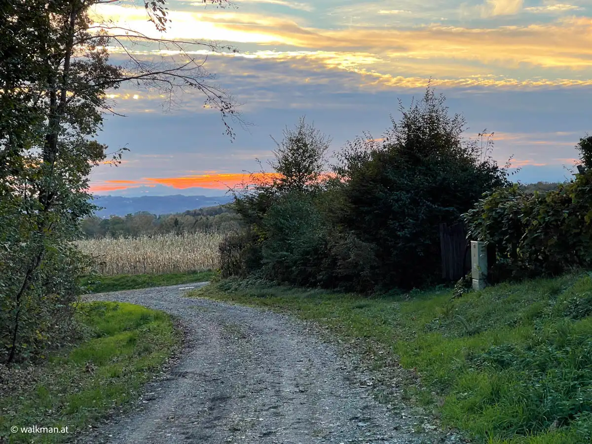 Aus dem Wald heraus geht es nun ein Stück weit über Land. Hier wieder mit schöner Aussicht ins Tal hinunter. Am letzten Teil des Weges sieht man auch über die Kellerstöckl hinweg ins Tal dahinter. Das wiederum gefällt mir und ich ordne es nun doch noch in eine letzte positive Überraschung ein. Quasi ein kleines „Sorry“ vom Hochkogel.