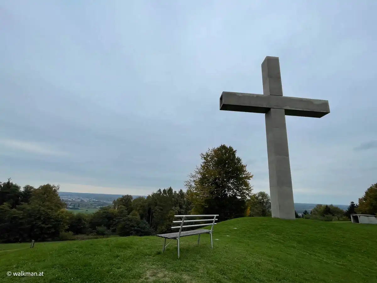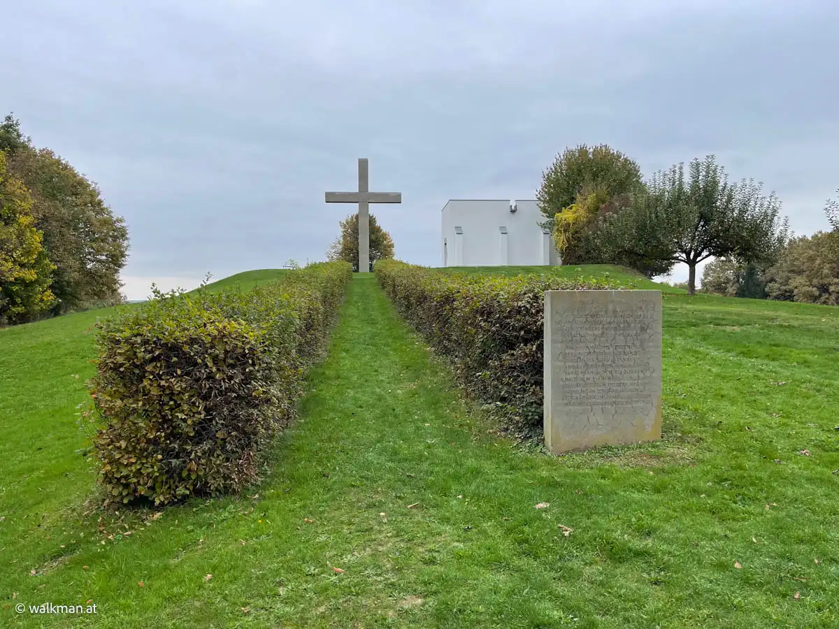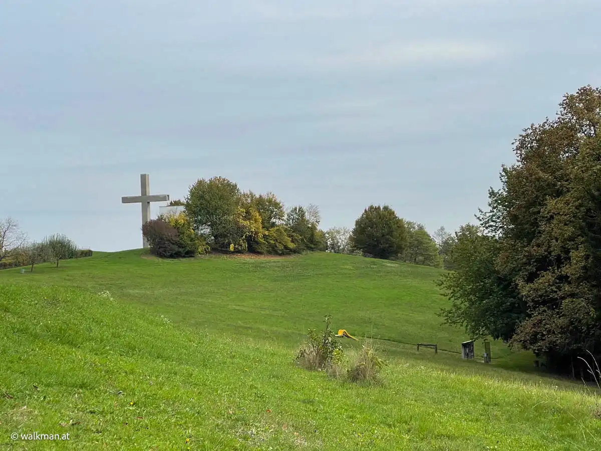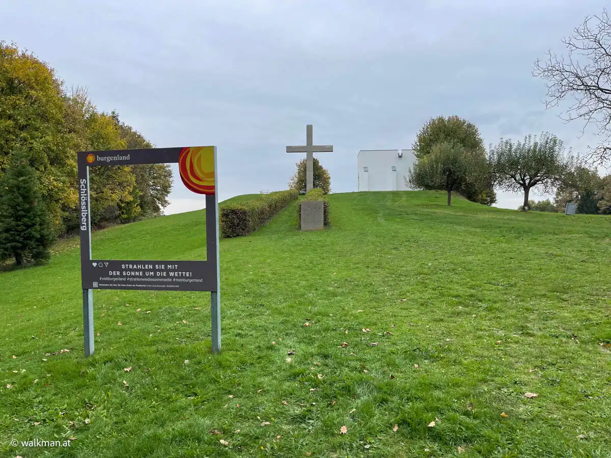 Ein Klassiker. Der allseits bekannte Burgenland-Rahmen erwartete mich am Fuß des Hügels, auf dem das Kreuz steht. Hier allerdings in Grau gehalten und nicht wie sonst überall, in Blau. Vermutlich Evolution 2.0. Sei‘s drum. Schnell war ich oben beim Kreuz und dem daneben positionierten Mausoleum.