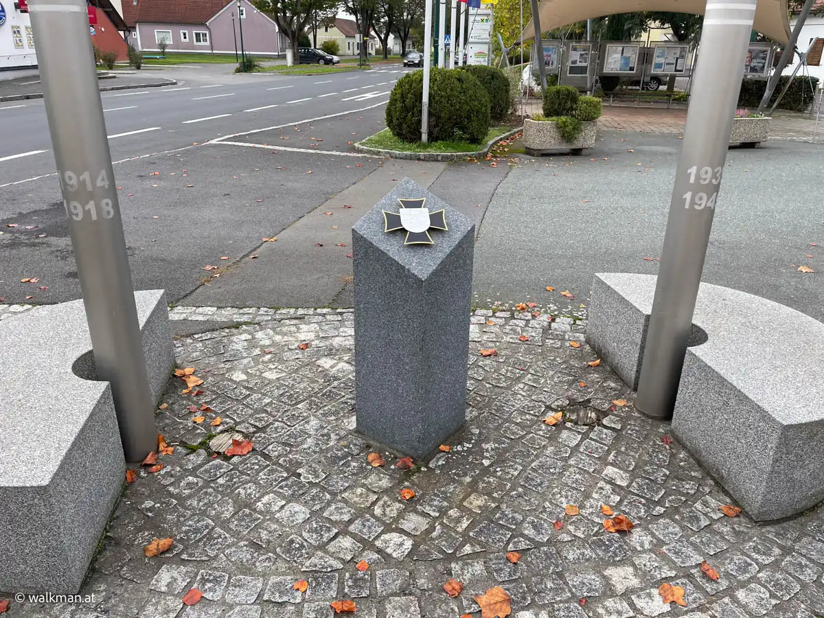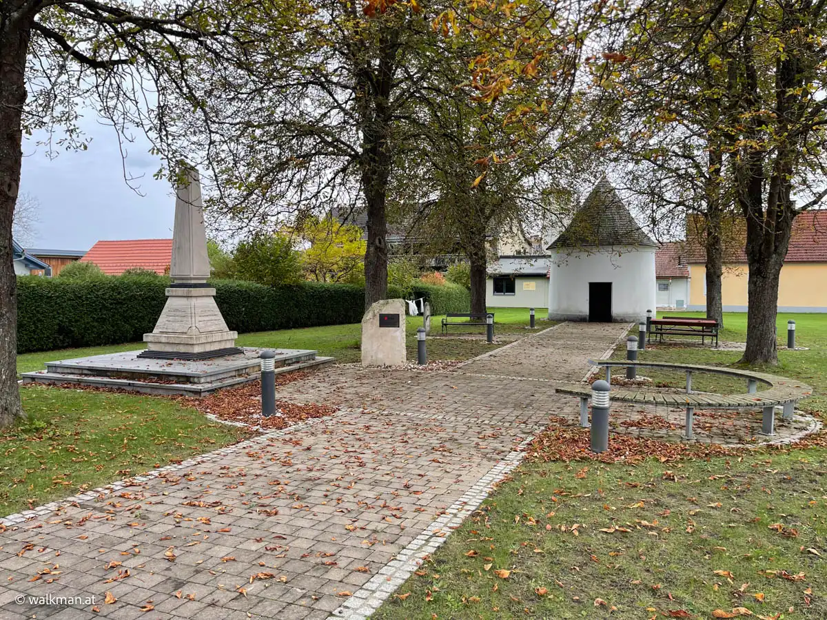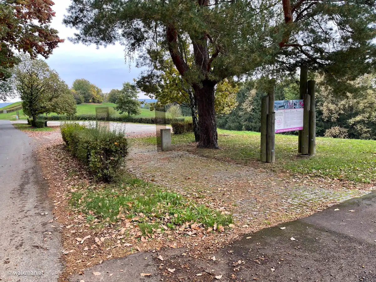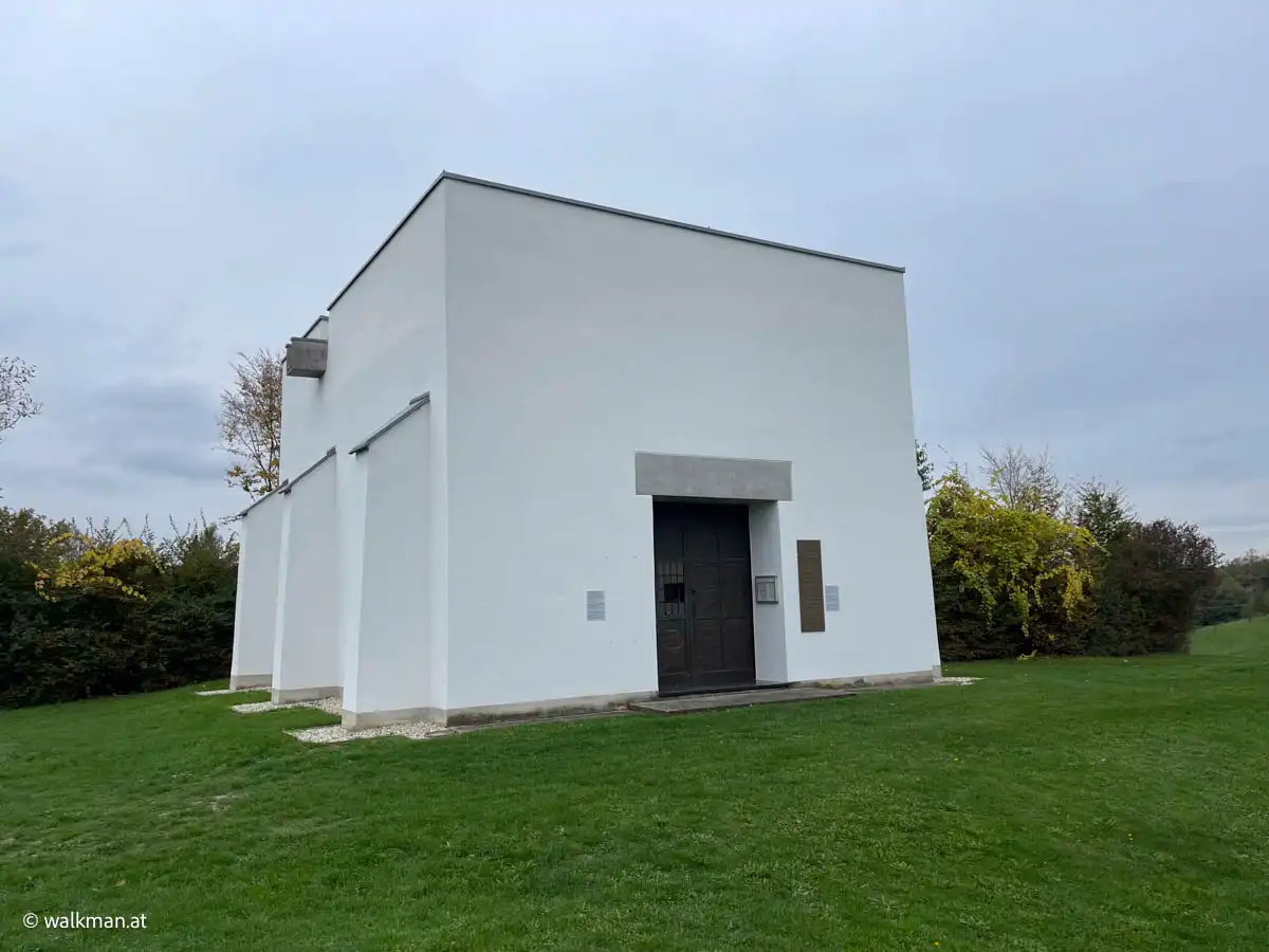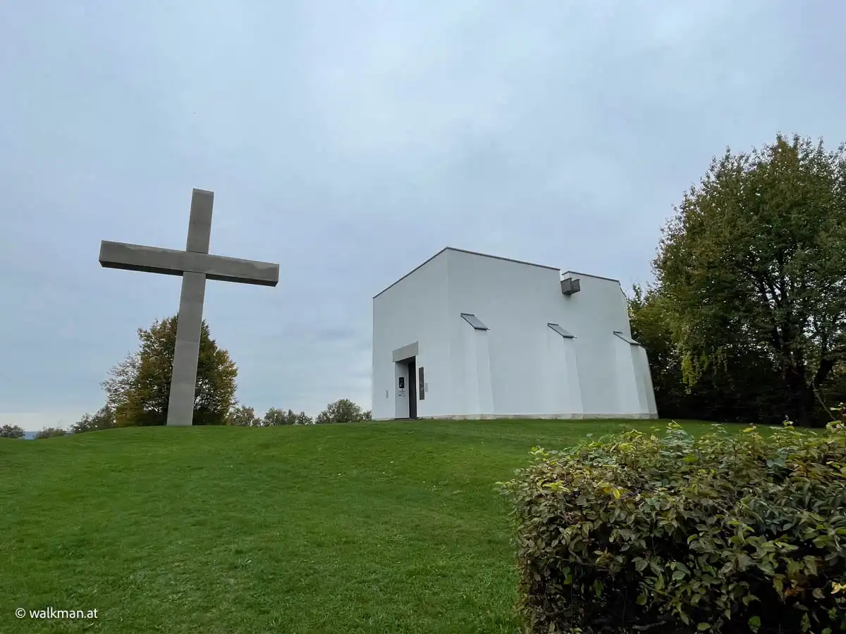 Ein Klassiker. Der allseits bekannte Burgenland-Rahmen erwartete mich am Fuß des Hügels, auf dem das Kreuz steht. Hier allerdings in Grau gehalten und nicht wie sonst überall, in Blau. Vermutlich Evolution 2.0. Sei‘s drum. Schnell war ich oben beim Kreuz und dem daneben positionierten Mausoleum.