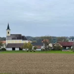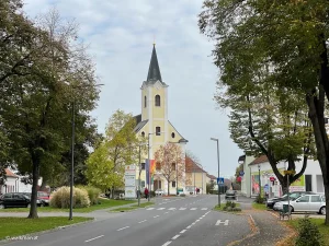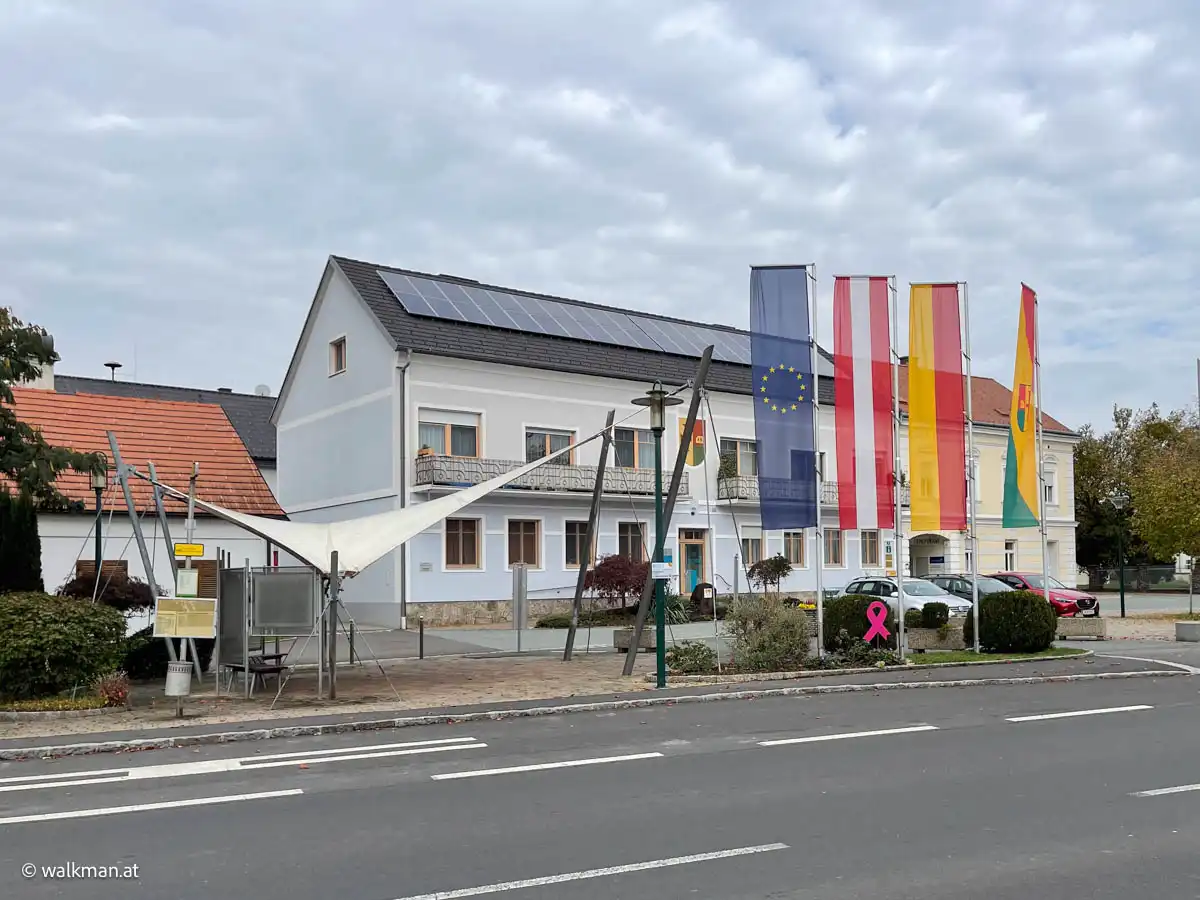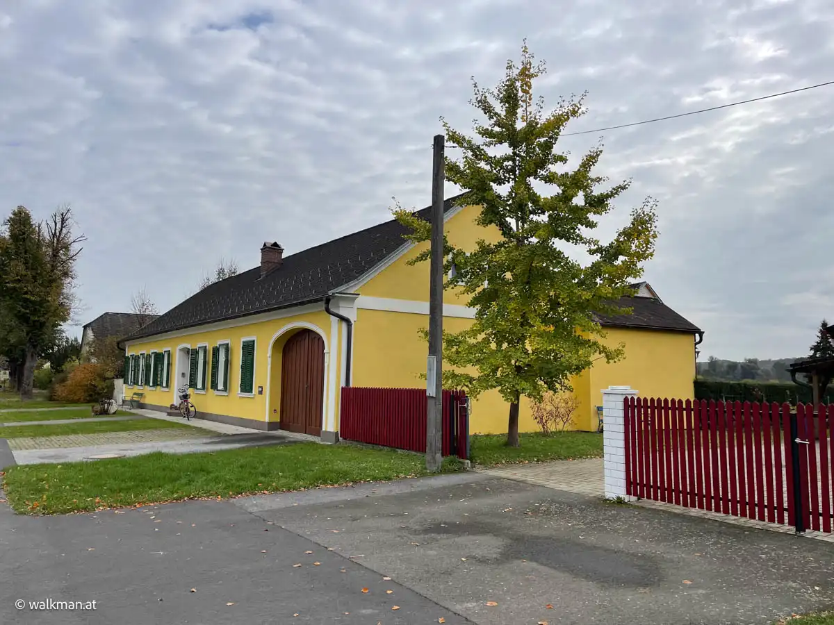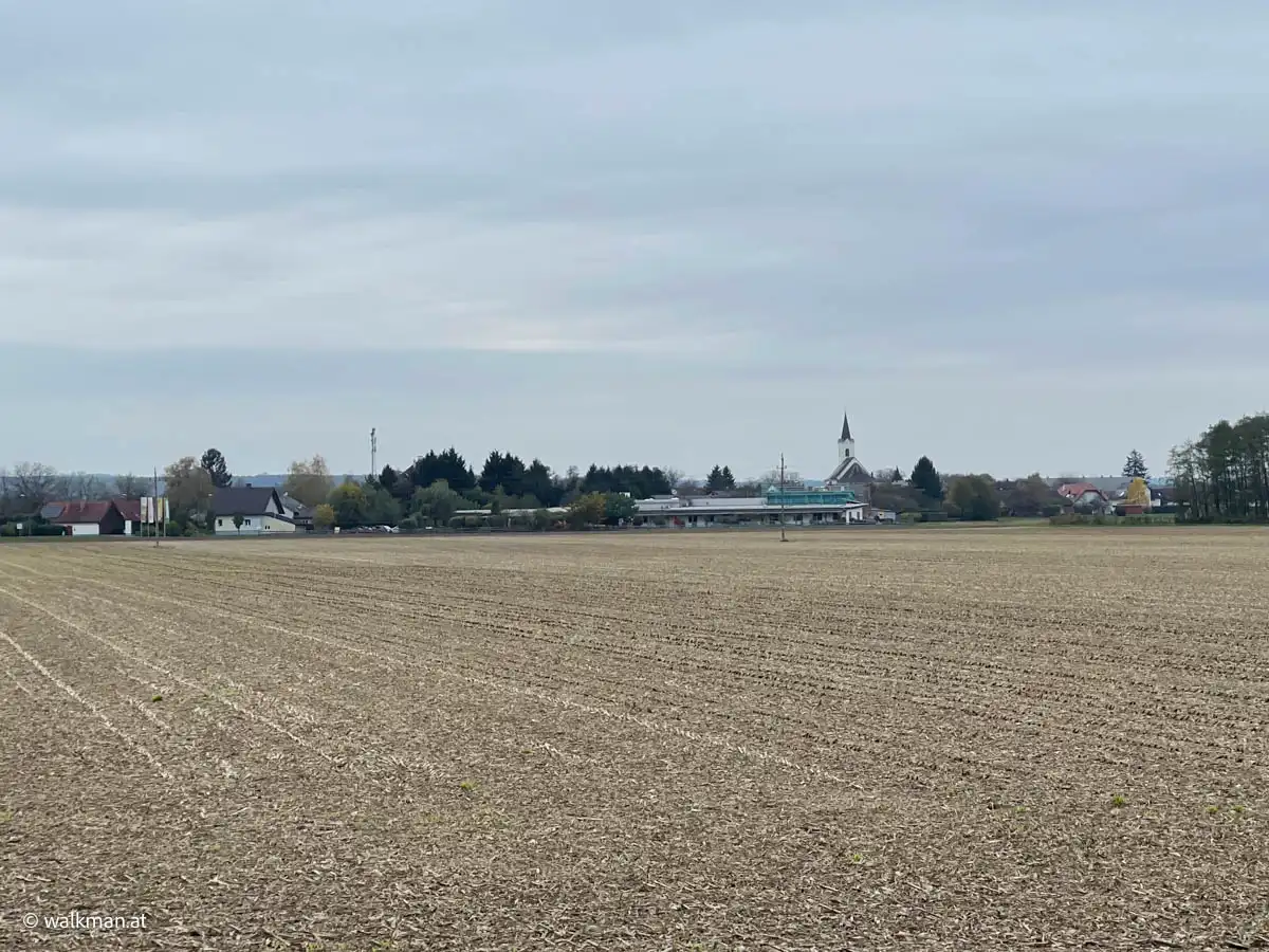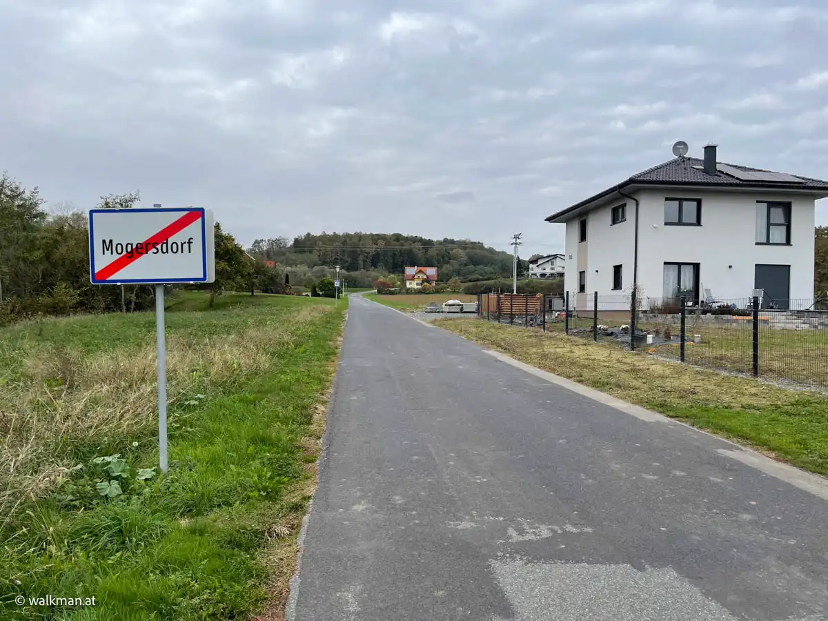 Wir wandern nun langsam wieder in das Ortsgebiet von Mogersdorf hinein. Genauer gesagt an dessen Ortsrand entlang. Die Kirche, das alte, mächtige Zollhaus, der Sportplatz. Und die ringsum stehenden Häuser von Mogersdorf. Dies alles „wandert“ langsam zu unserer Rechten vorbei.