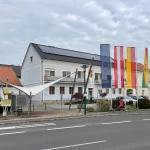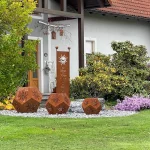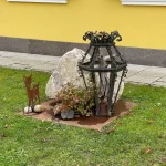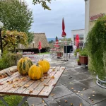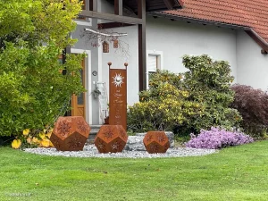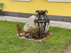 Von einem antik wirkenden Weinfass über einen dekorierten, alten Brunnen bis zum historischen Heuwagen. Und alles dazwischen und außerhalb (um es mit Jan Böhmermann zu sagen). Dazwischen immer wieder Blumen in gepflegten Arrangements. Das gefällt uns außerordentlich. Wirklich schön. Mit viel Liebe gemacht.