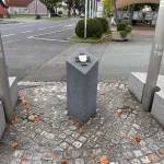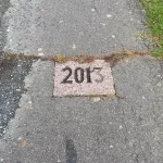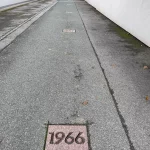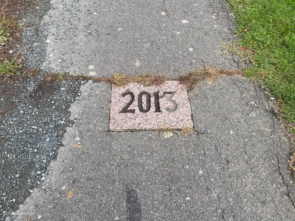 Angekommen bei der Kirche, spazierten wir hier nun links, in die Gasse hinein. Natürlich nicht ohne vorher einige Fotos zu schießen und einen kurzen Blick auf die Routenführung zu werfen. Ja, hier sind wir richtig. Das bestätigte uns auch unser Untergrund. Hier sind, in regelmäßigen Abständen, wiederkehrende Jahrestafeln in den Asphalt eingelassen.