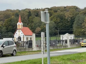 Hier schien aktuell ein Begräbnis stattzufinden. Viele geparkte Fahrzeuge und noch mehr ankommende deuteten darauf hin. An der Aufbahrungshalle vorbei wandernd wurde unsere Vermutung dann auch bestätigt. Hier warteten bereits zwei, sichtlich dafür erkorene, Sargträger, vor dem Gebäude auf ihren zu erwartenden „Gast“. Und das ist nicht einmal sarkastisch oder zynisch gemeint, sind wir ja zu Lebzeiten auch nur Gast auf diesem Planeten.