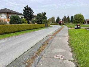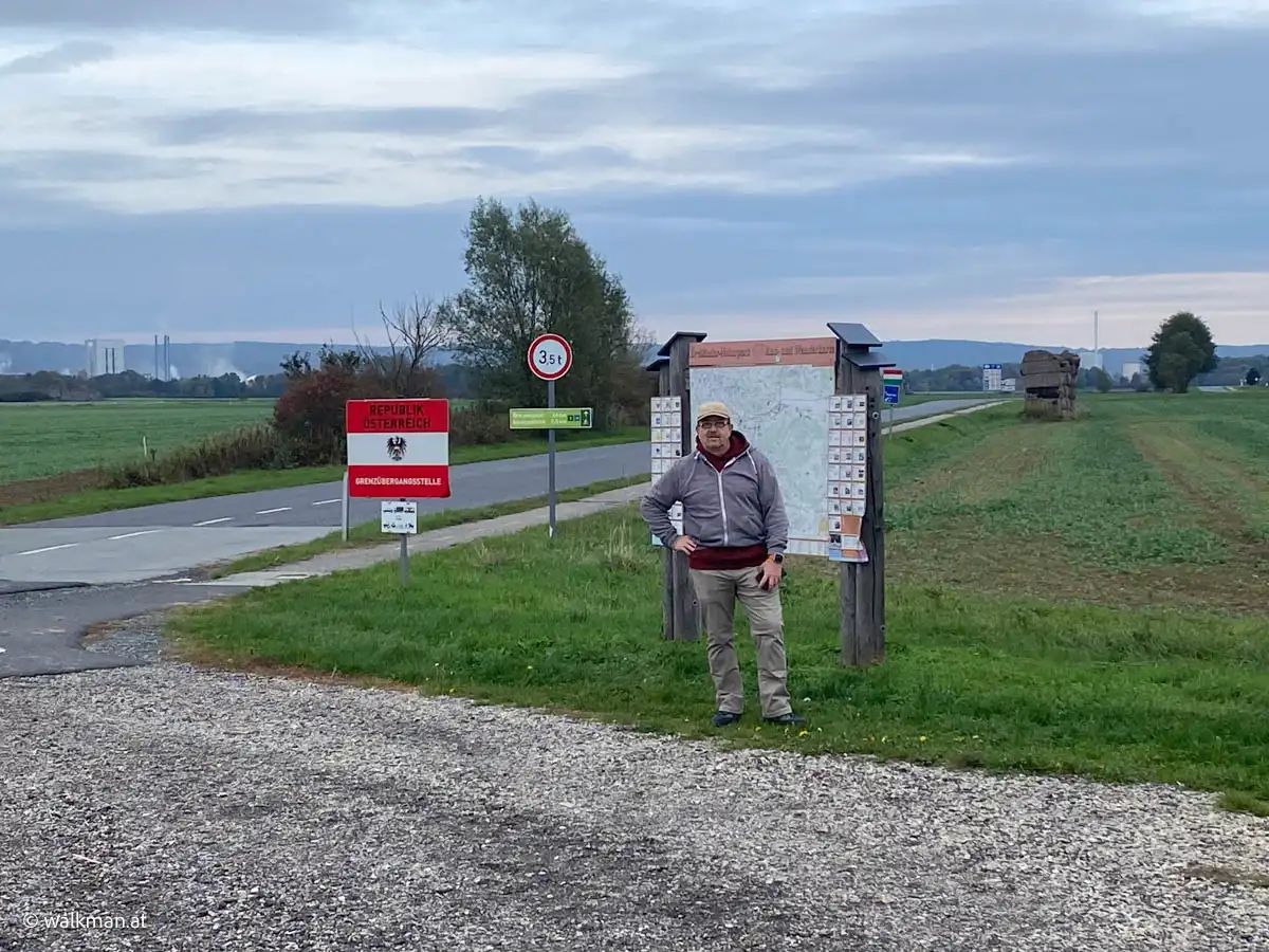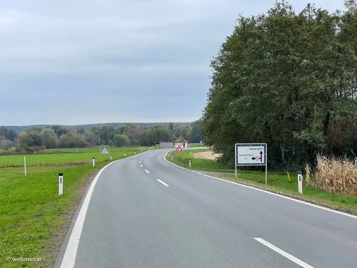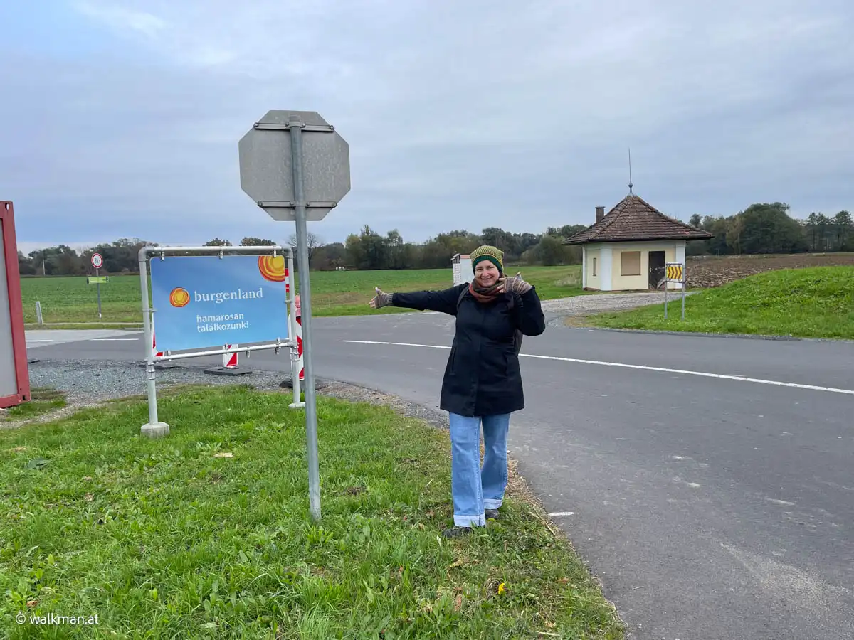 Auf dieser wandern wir nun, nach rechts Richtung Mogersdorf, entlang. Zunächst auf einem asphaltierten Radweg, parallel zur Straße. Der aber bald wieder, von der Straße wegführend, endet. So marschieren wir kurzerhand ein etwa 500 Meter langes Teilstück, am linken Straßenrand und gleichzeitig der Staatsgrenze, entlang.