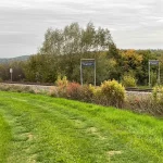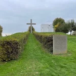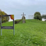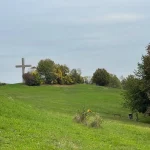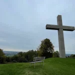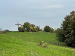 Etwa 50 Meter vor dem „Gipfel“ sahen wir dann, in einiger Entfernung zu unserer Rechten, das große Betonkreuz, das zum Friedensweg gehört. Hier ist auch eine gemähte Schneise in die Wiese, rechts von uns, rein. Die Route des Friedenswegs. Nur ein kleiner, verbaler Versuch noch.