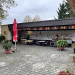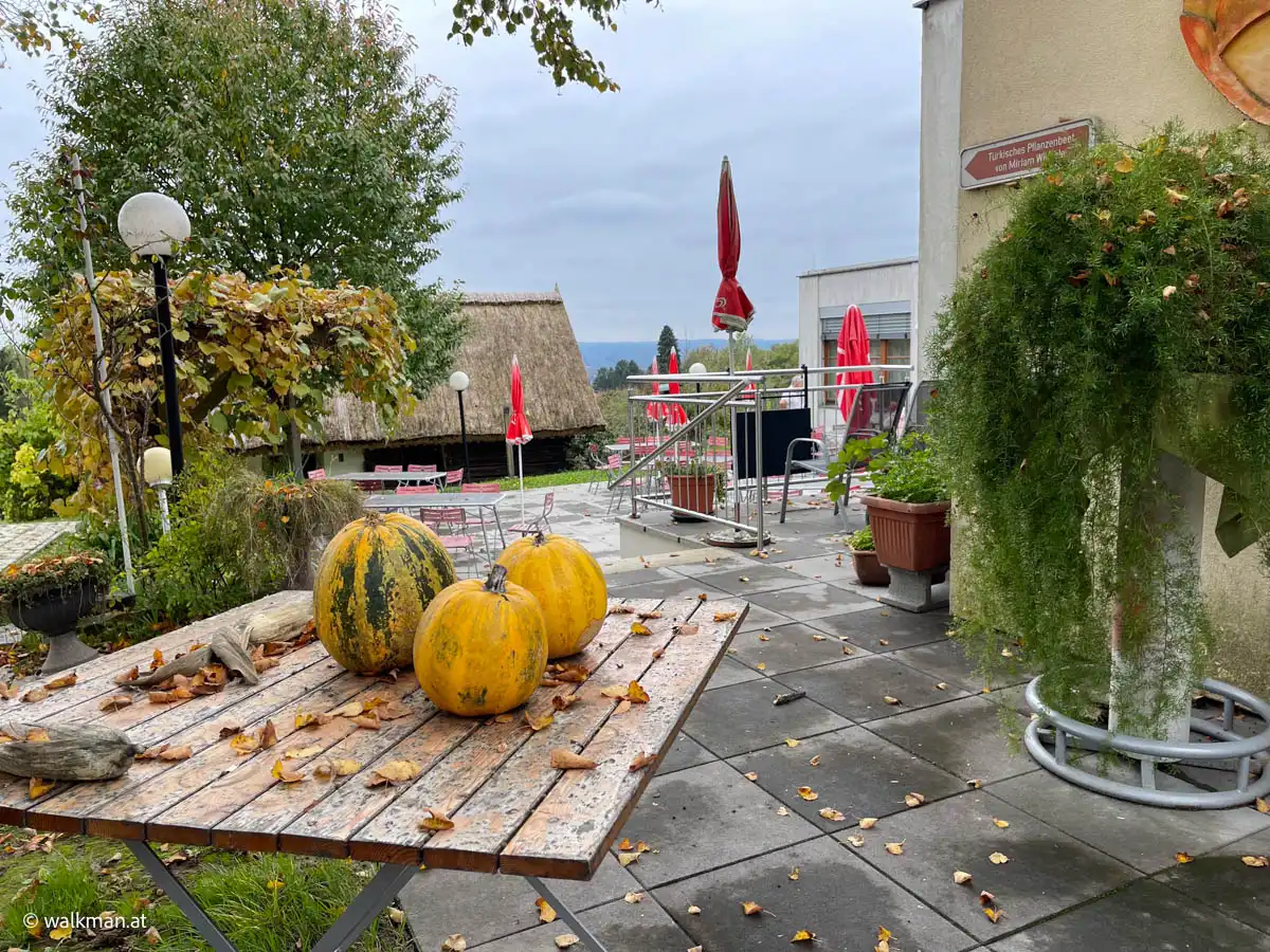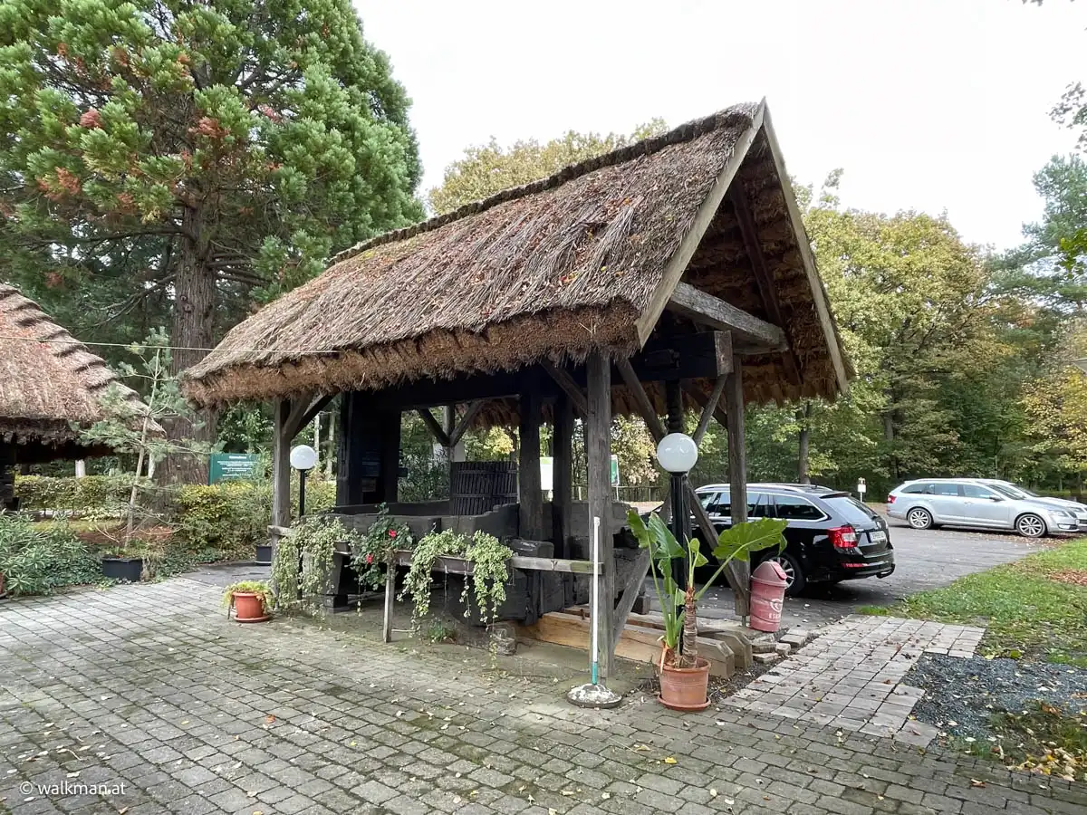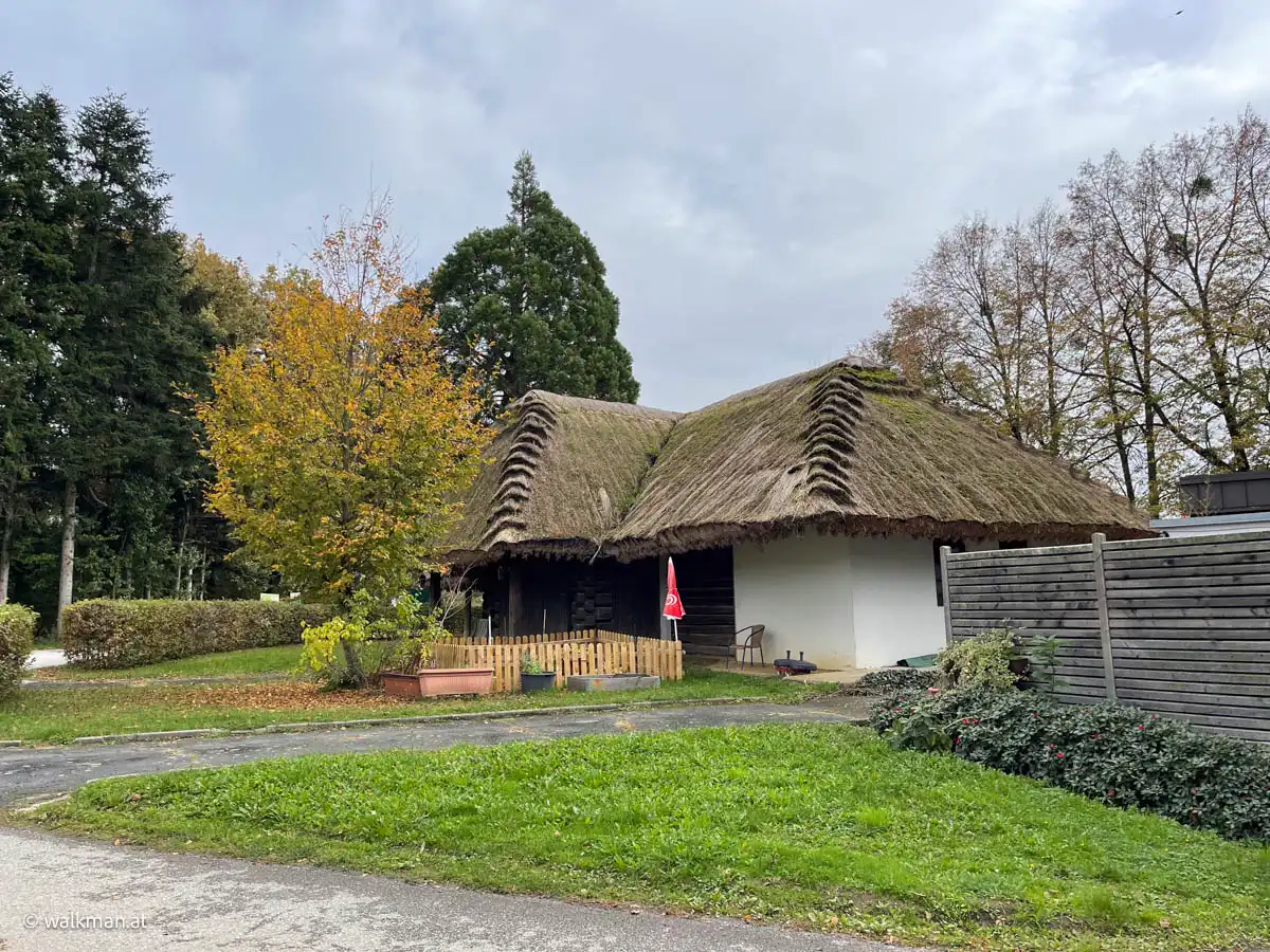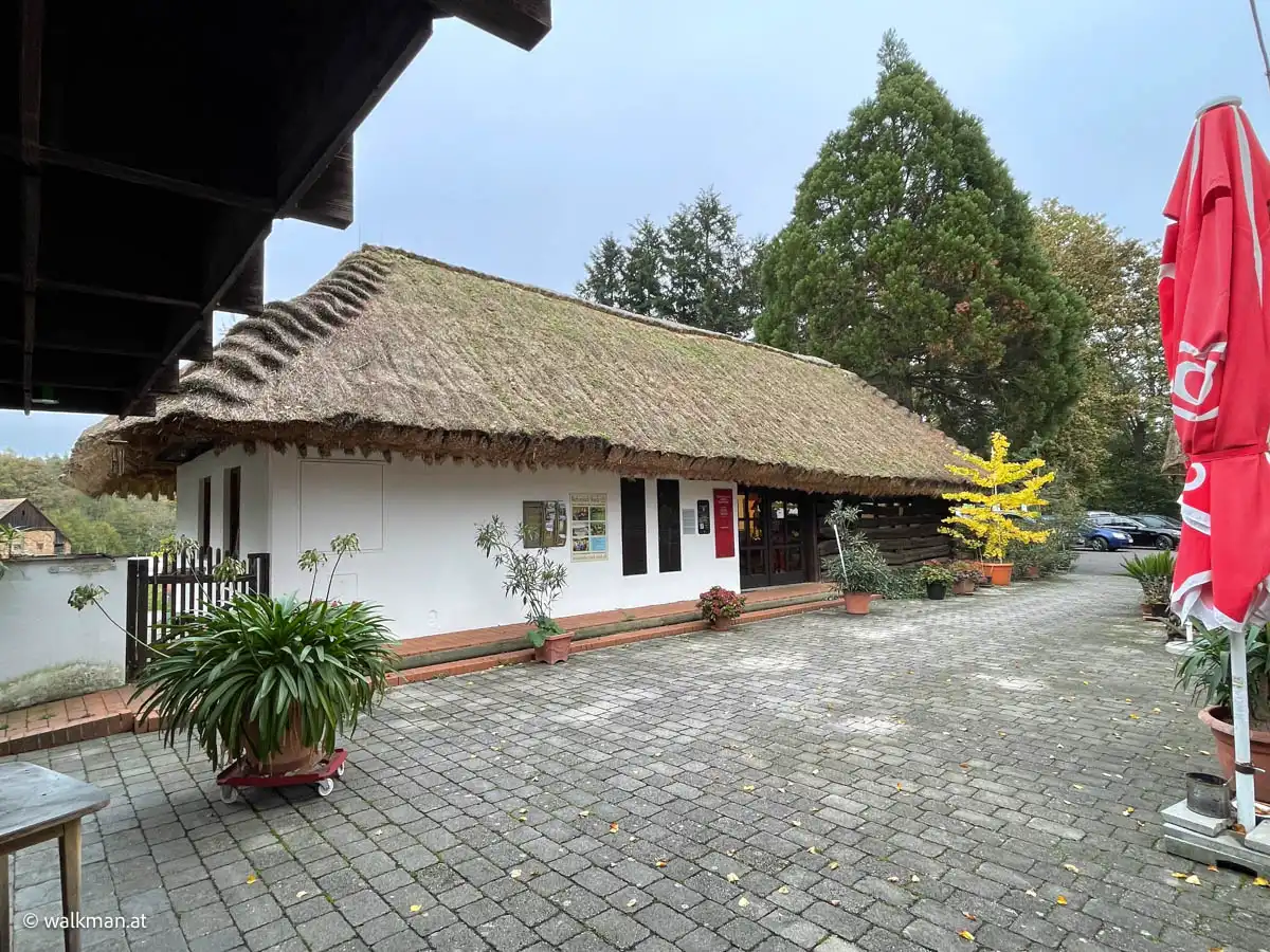 Oben angekommen noch einmal nach rechts und schon standen wir vor dem schilfgedeckten „Kreuzstadl“. Und gleich daneben das „Restaurant zum Kreuzstadl“. Nur kurz hatten wir beide eine „Panikattacke“. Hier stand am Parkplatz nur ein Auto. Ob das Restaurant geschlossen hat?