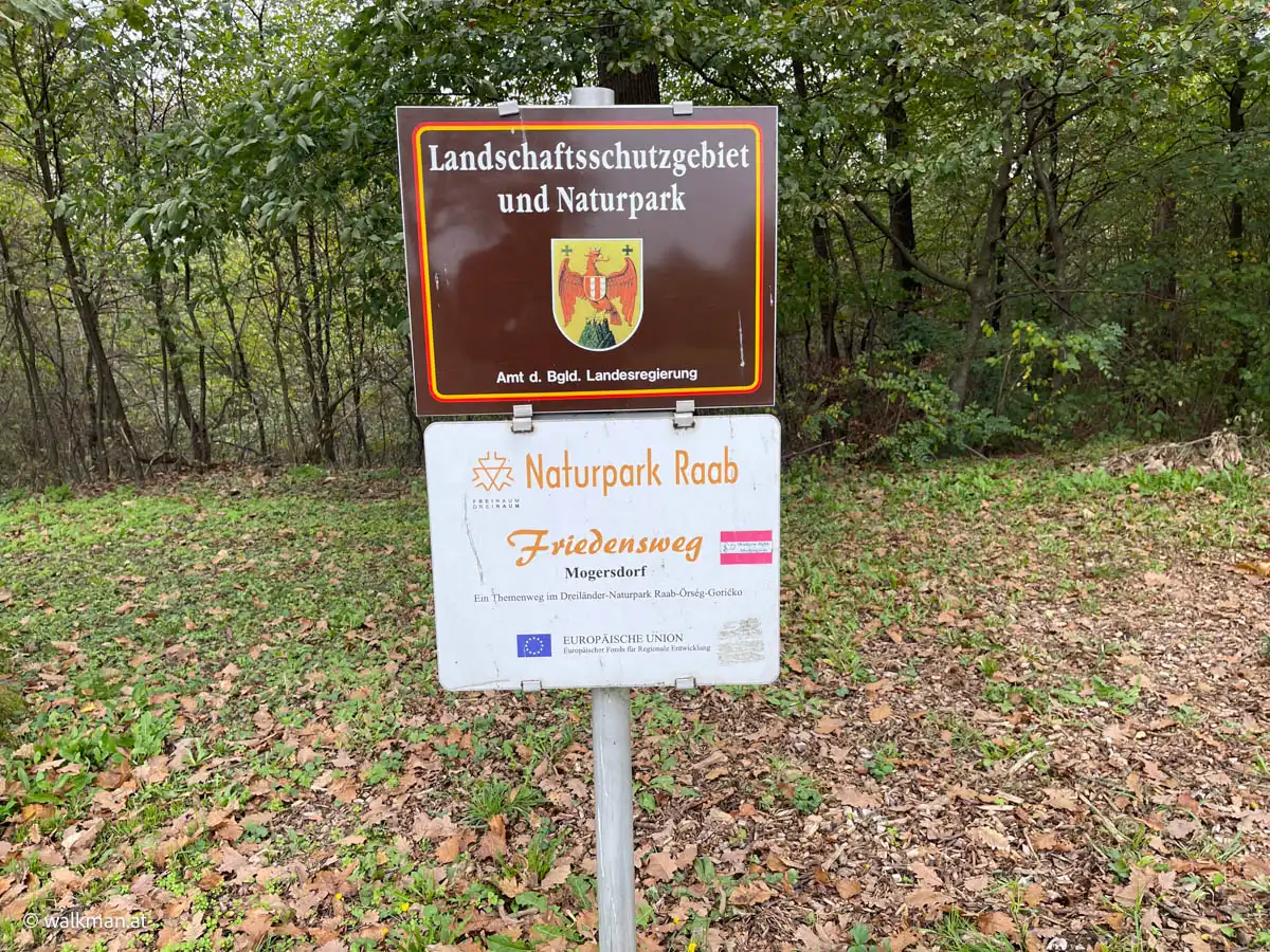 Fündig wurde ich in Mogersdorf. Hier gibt es den „Friedensweg“. Und auf etwa halber Strecke, nach gut 3 Kilometern, ein Gasthaus zur Rast. Dort hinauf führte allerdings ein Anstieg. Weil aber die Strecke deutlich kürzer war, als Manuelas Vorgabe und sie außerdem im Gasthaus bleiben konnte, während ich den Rest der Strecke ging, unterbreitete ich ihr meinen Vorschlag.