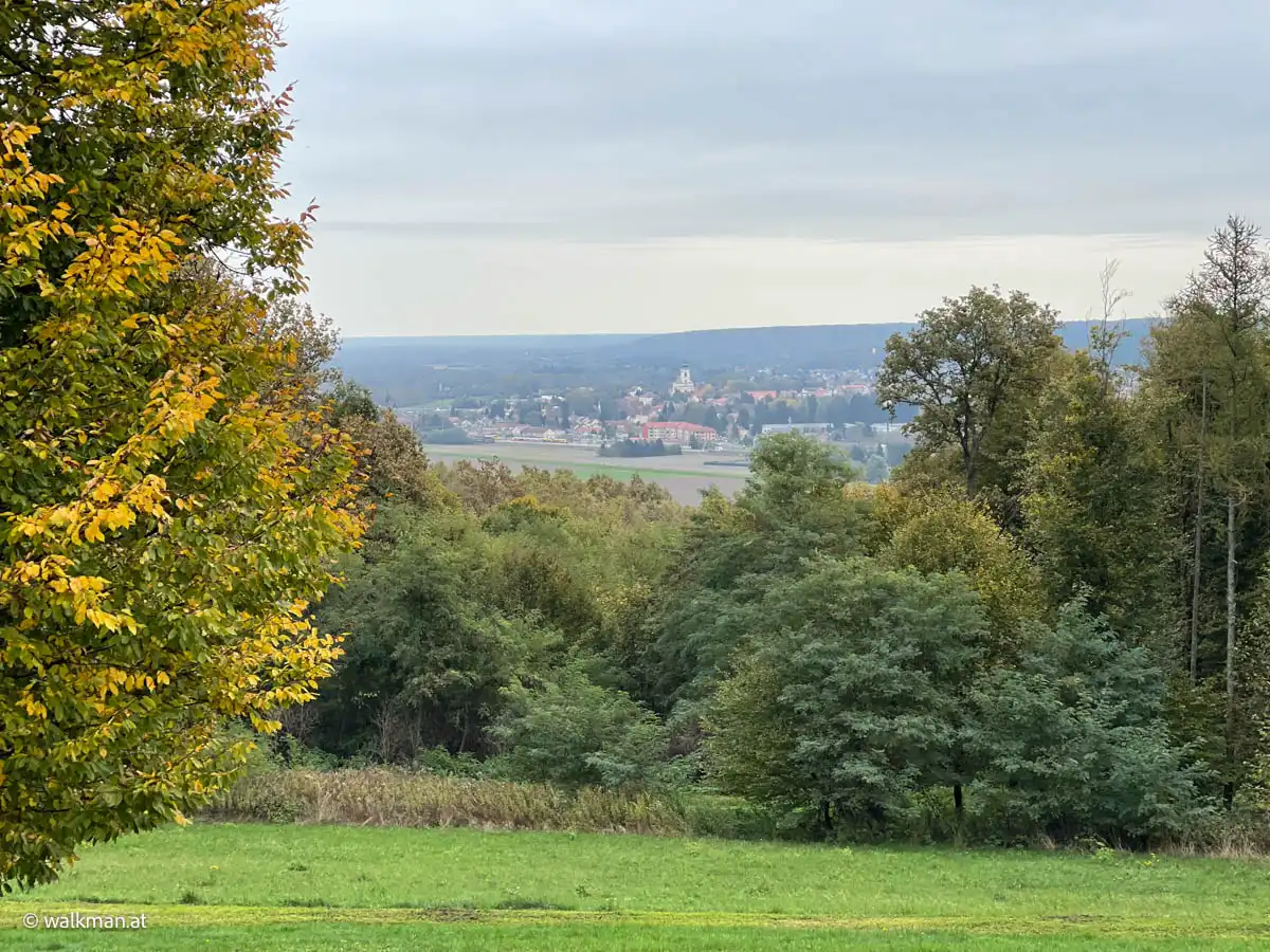 Von hier aus hat man auch eine schöne Aussicht auf Mogersdorf. Sicher nicht so schön wie bei Sonnenschein. Aber auch dieses heutige, oktoberhafte „graue“ Ambiente hat etwas Mystisches, Konzentriertes an sich. Die bunten Farben des Herbstes passen da perfekt dazu. Also auch Zeit für Fotos.