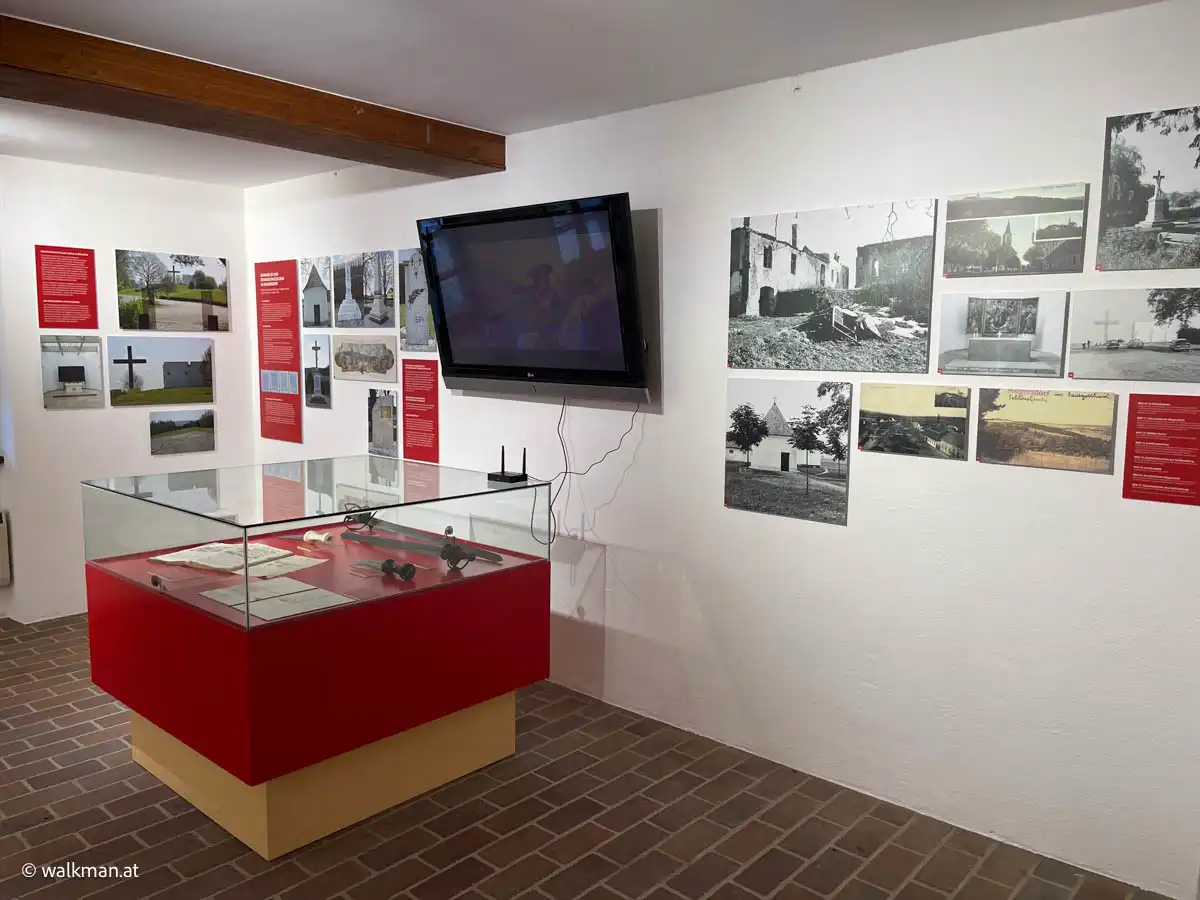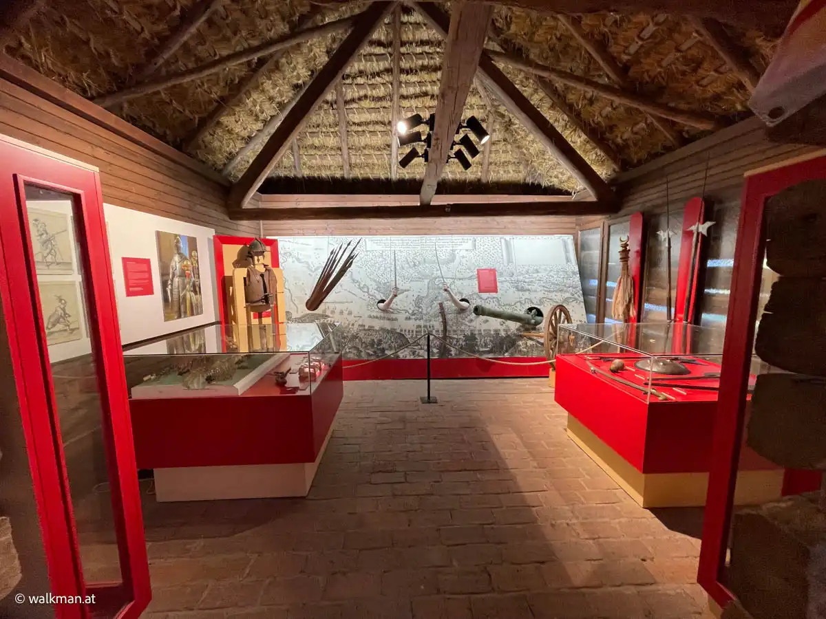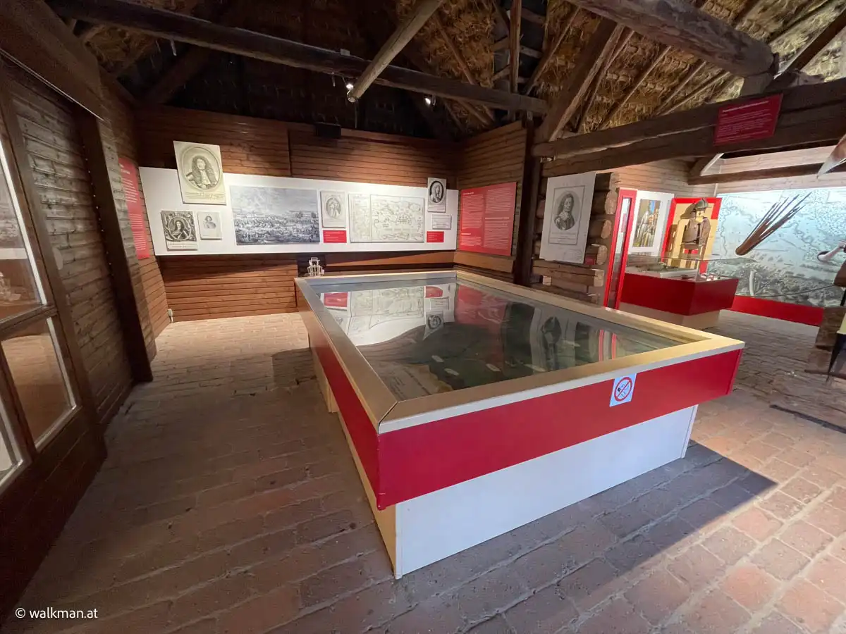 Nach dem „Friedensweg“ ist vor dem „Türkenschlacht-Museum“. Dieses befindet sich im urtümlichen, schilfgedeckten Gebäude des „Kreuzstadls“. Und wenn ich schon mal da bin, wird dieses natürlich auch besucht. Hier herinnen findet man, verteilt auf drei Räume, allerlei Wissens- und Sehenswertes rund um die historische Schlacht im Raabtal, in der Umgebung um Mogersdorf und Wallendorf.