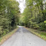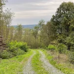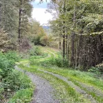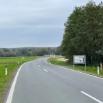 Von der Beschaffenheit jedenfalls ist dieser Weg durch den Wald von der angenehmen Sorte. Festgefahrene, flache Fahrspuren, mit wenig lockeren, größeren Steinen. Schön zu gehen. Bis zu Streckenkilometer 5,4. Hier treten wir aus dem Wald heraus, im Blick die Bundesstraße vor uns.