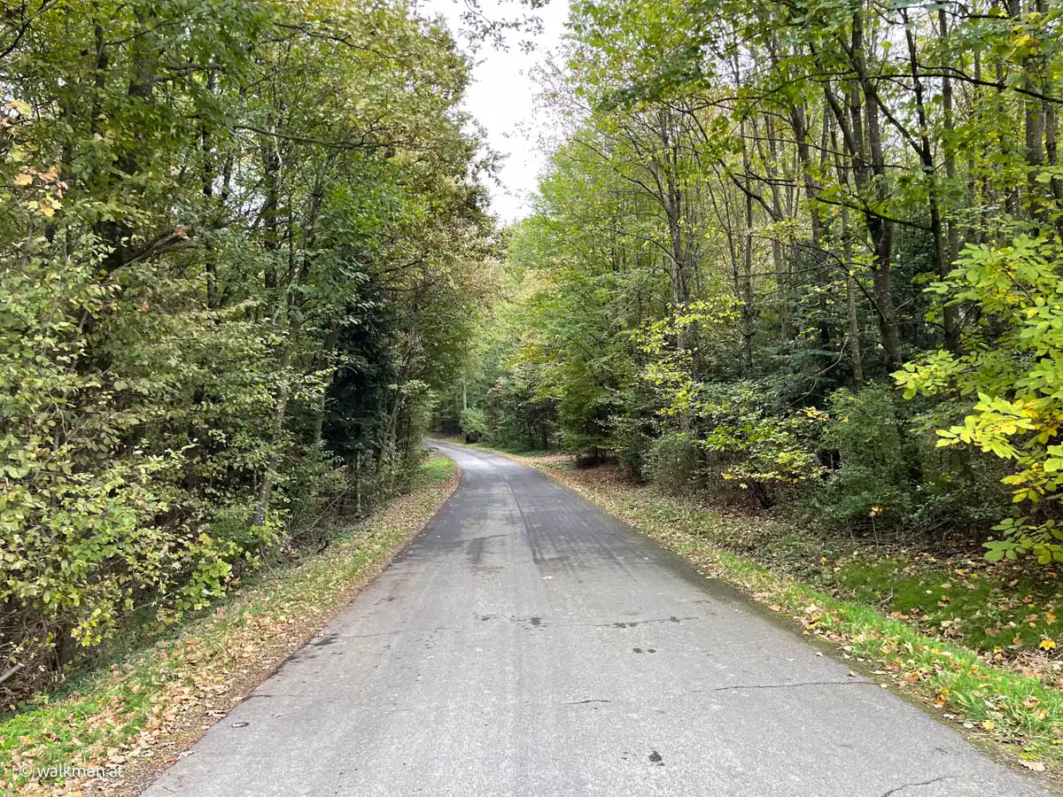 Nach der nächsten Kurve ging es tatsächlich ein Stück weit flacher, nur leicht ansteigend, weiter. Hier wanderten wir nun durch einen kleinen waldartigen Abschnitt dahin. Rechts, hangseitig, nach wie vor Häuser. Links, talseitig, Wald. Ein wenig frischer als zuvor, aber unsere warmen Körper glichen dies ohnehin aus. Mitunter auch mit Schweiß, der sich langsam den Weg von unserer Haut weg, durch unsere T-Shirts bahnte.