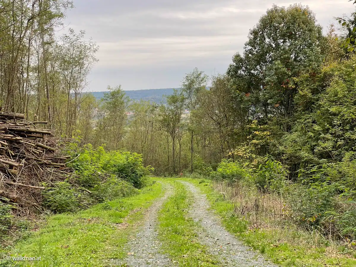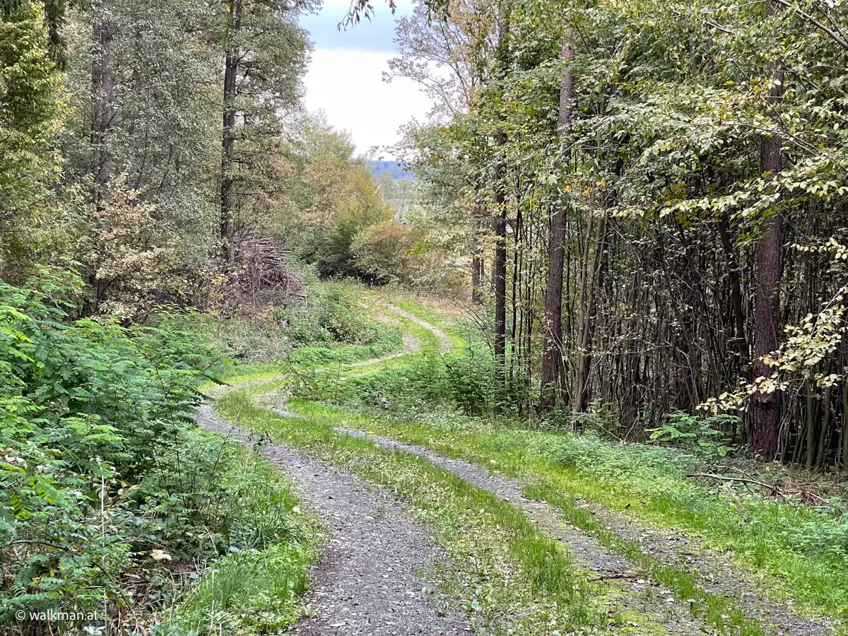 Bald waren wir an der Kurve angekommen, an der es geradeaus weiter zum „Bürgermeister“ gehen würde. Nein, diesen wollten wir heute nicht besuchen. Wir hielten uns an den Pfeil nach rechts, auf dem der „Schlösslberg“ ausgewiesen war. Da wollten wir hin. Und abermals zog der Anstieg wieder ein wenig mehr an.