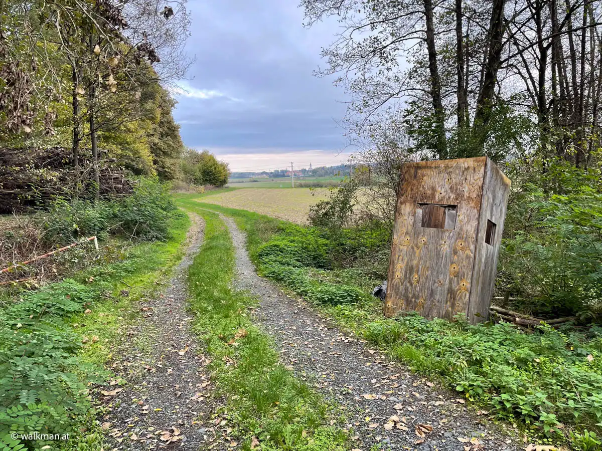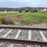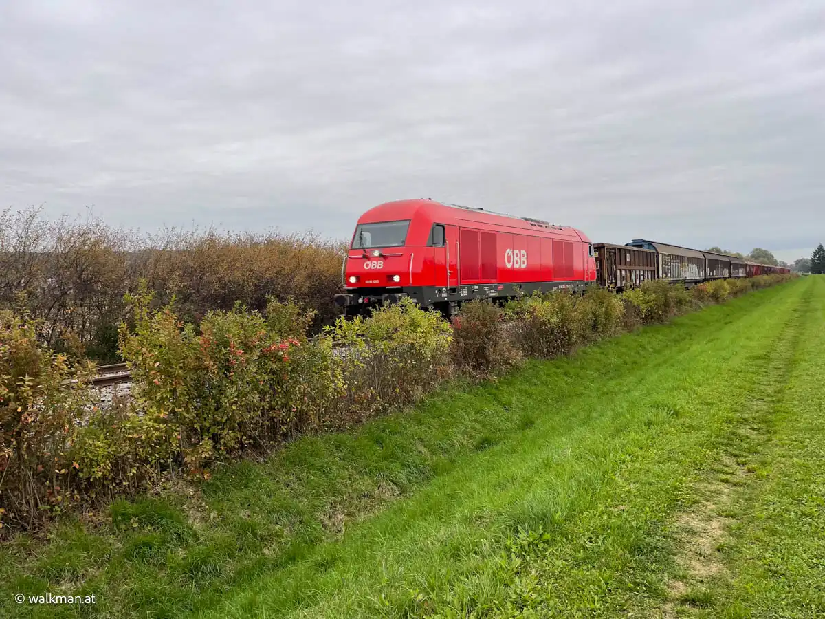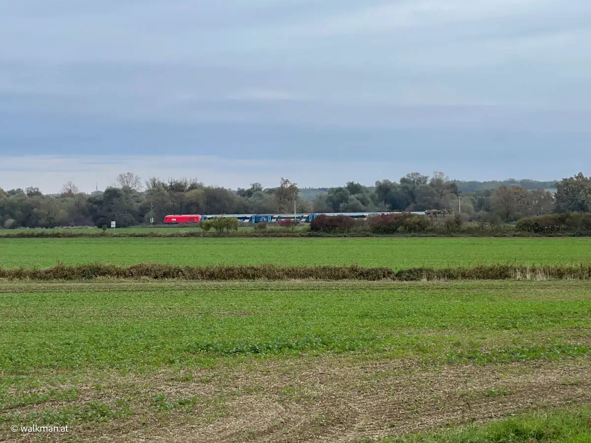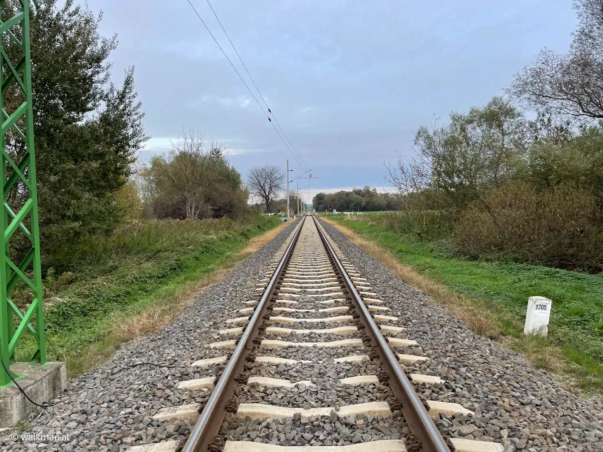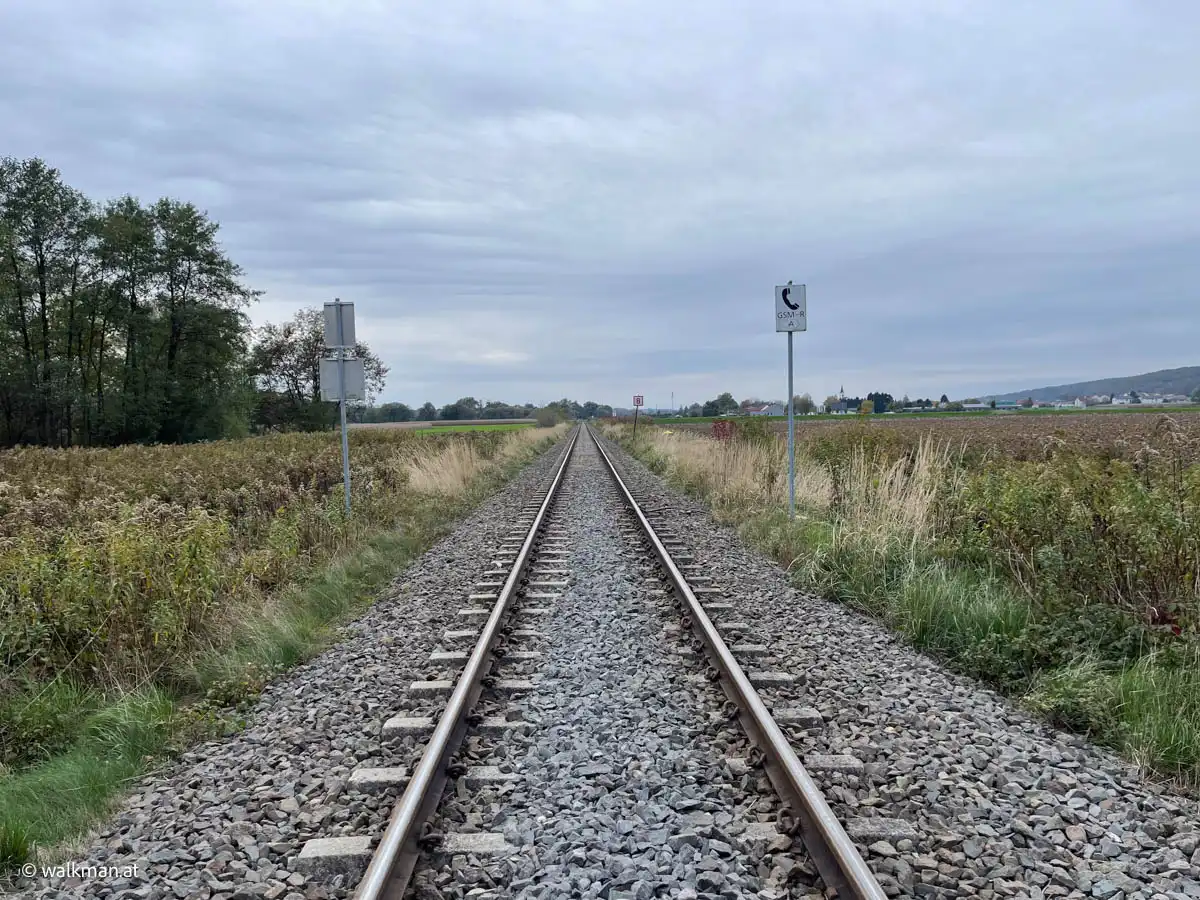 Aus den Optionen „weiter, etwa 500 Meter, an der Bundesstraße entlang“ oder „den Feldweg rein und neben den Eisenbahnschienen Richtung Mogersdorf“ wählte ich die Letztere. Und hoffte auf einen halbwegs begehbaren Weg neben den Gleisen. Weil am Satellitenbild war nicht wirklich etwas Adäquates zu erkennen.