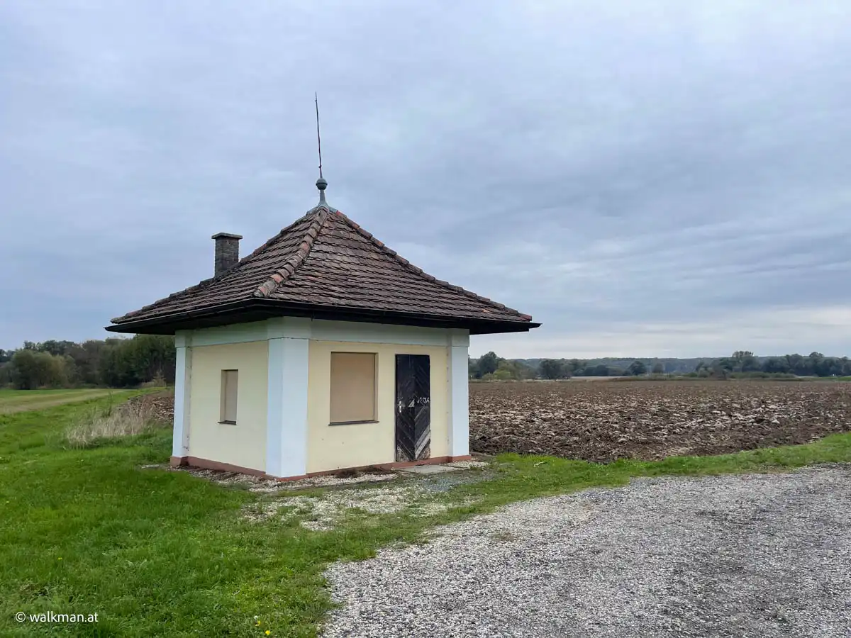 Diesmal war der Parkplatz für unser Vehikel bereits von mir im Web ausgemacht worden. Bei der Kapelle am Ortsende spuckte Google das „P“ aus, was unschwer als Parkplatz zu interpretieren ist. Und so war es dann auch. Auto abgestellt. Tracker auf „On“. Jacke, in Manuelas Fall, angezogen. Oder locker, für später, um die Hüften geknotet. Das war meine Variante. Trinkflaschen verstaut. Los geht’s.