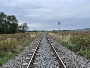 Und genau dieser kam etwa 200 Meter später. Der Feldweg wurde immer weniger gut begehbar und wir mussten vermehrt durch hohes Gras stampfen. Und am Ende war … er zu Ende. Da war kein Weg weiter zu sehen. Wohl aber sahen wir die Gleise vor uns, die rechts nach Mogersdorf führten. Auf einer nicht endend wollenden Gerade. In beide Richtungen.