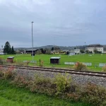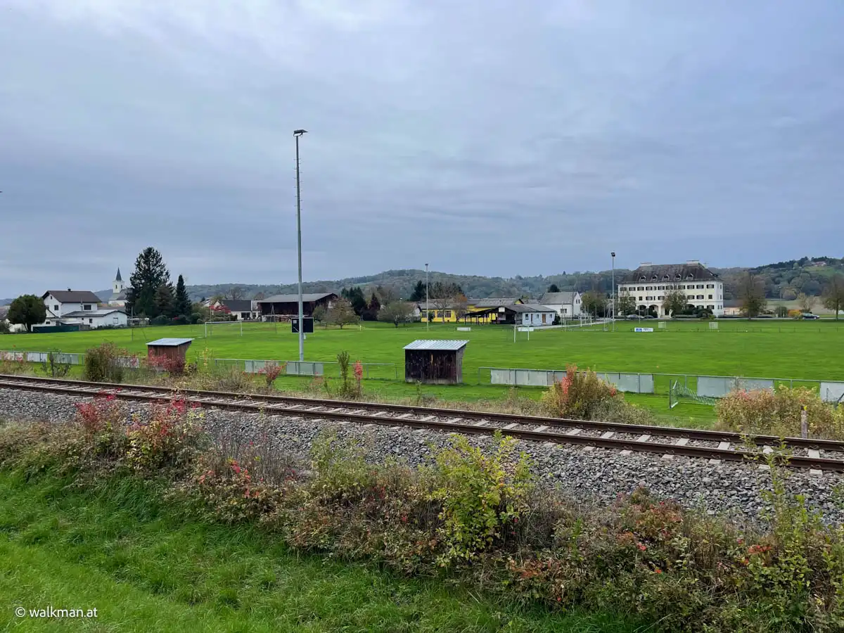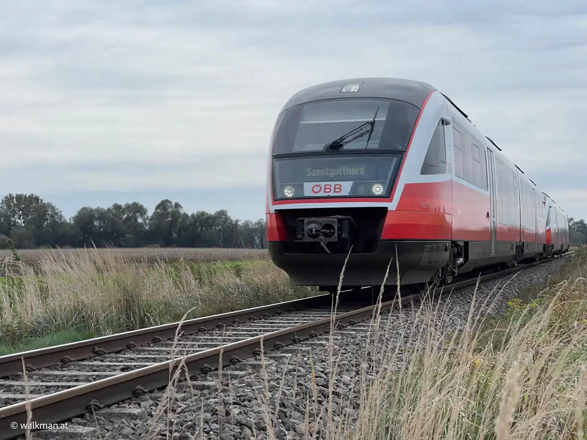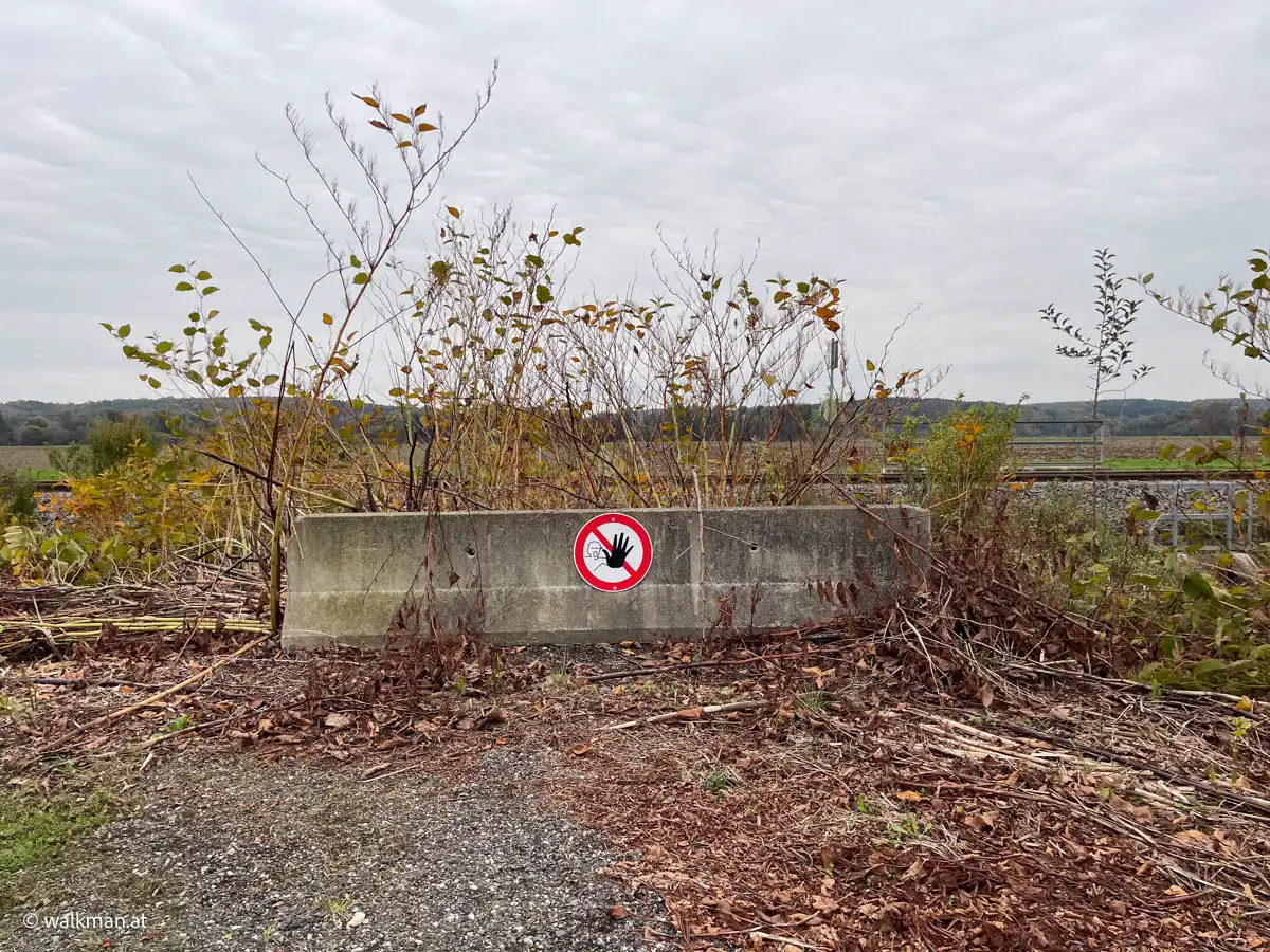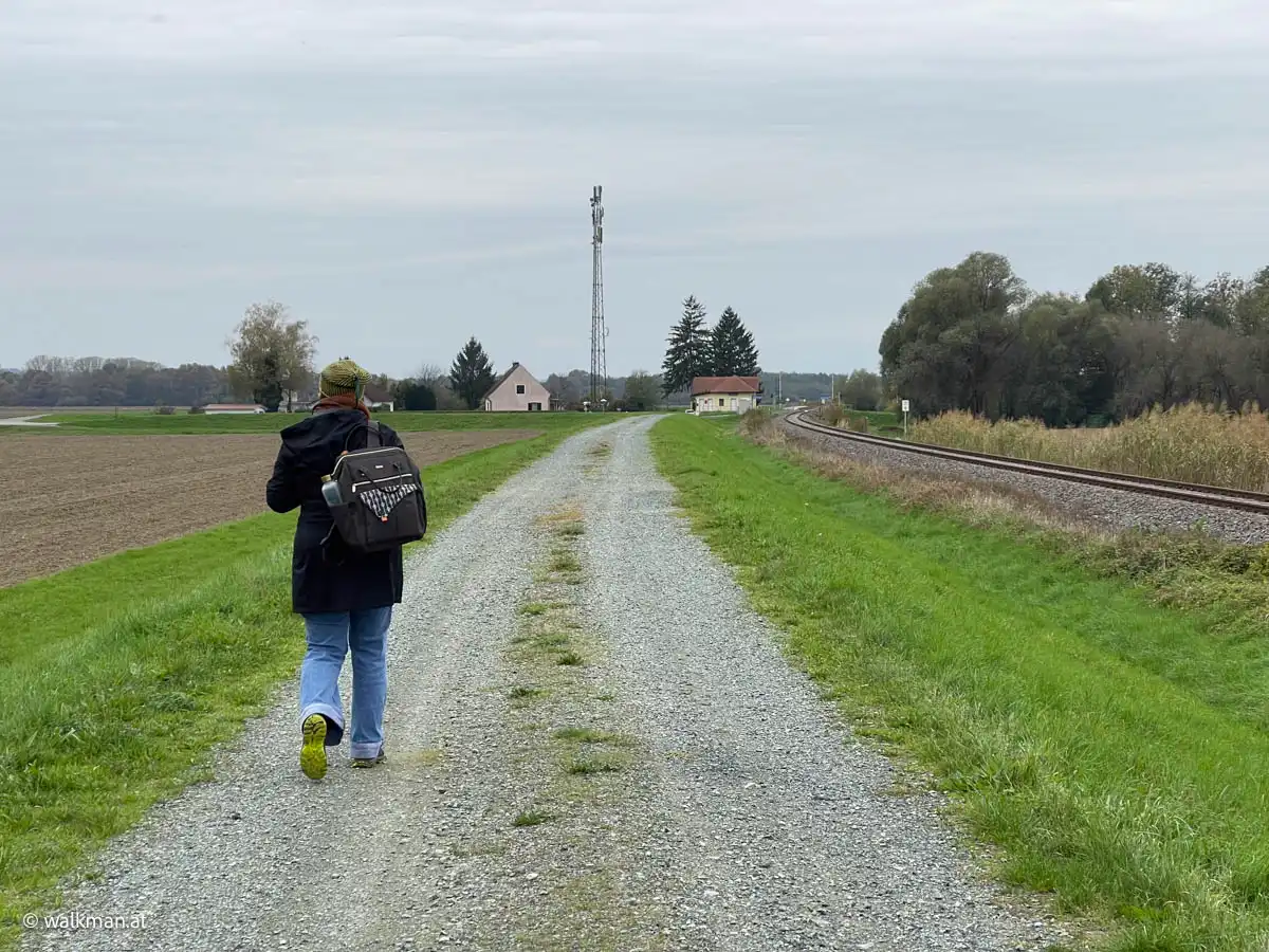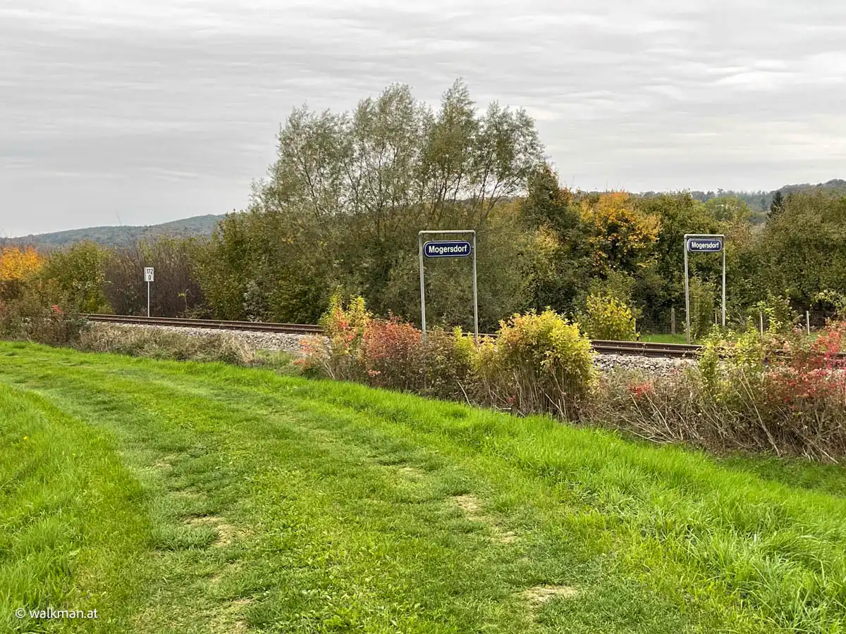 Apropos Wandern. Der Damm ist nun zu Ende und wir marschieren wieder auf einem angenehm zu gehenden Schotterweg dahin. Bis zur kleinen Station „Mogersdorf“. Oder darf man da schon „Bahnhof“ dazu sagen? Ok, Baby-Bahnhof. Hier müssen wir nun eine kleine Schleife gehen, um das Bahnhofsareal herum. Noch ein Kilometer bis zum Ziel.
