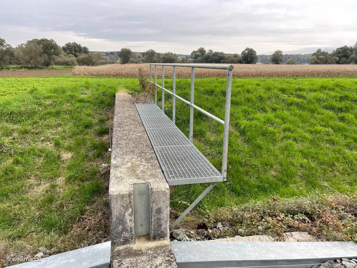 Nun kamen wir an eine Art betonierte Brücke. Oder so. Auf jeden Fall schien das Konstrukt eher dem Gleiskörper, als einem Übergang zu dienen. Aber am ehesten gehörte es wohl zur Verbindung zwischen den Gleisen und dem Damm, der ab hier parallel zu den Gleisen verläuft.