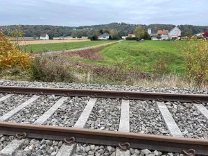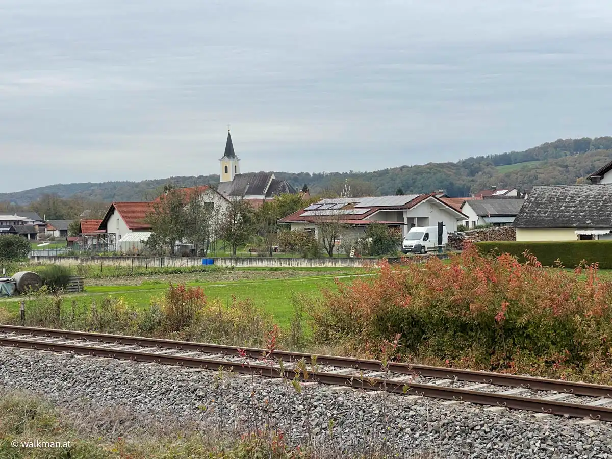 Nun marschieren wir wieder am Damm parallel zu den Gleisen. Bald sollten wir auf einen Weg treffen, der rechts weg, in die Gasse hinein führt, wo unser Auto steht. Sicherheitshalber werfe ich einen Blick auf mein Handy. Ja, gleich sollte er kommen. Die Gasse am „anderen Ufer“ der Gleise konnte ich schon sehen.