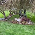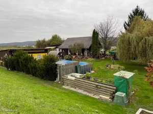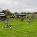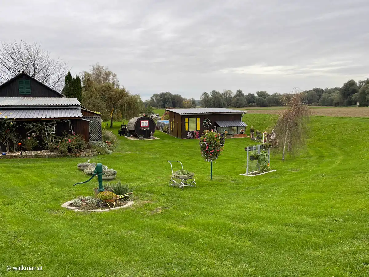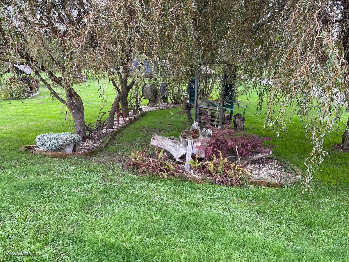 Nach diesem, auf der Schleife, kurzen asphaltierten Abschnitt wechseln wir wieder auf den Dammweg. Hier kommen wir an einem sehr kreativen Garten vorbei. Wirkt ein wenig chaotisch, aber nicht ungepflegt. Viele, viele Sammelstücke von klein bis groß sind hier gelagert oder extra prominent positioniert.