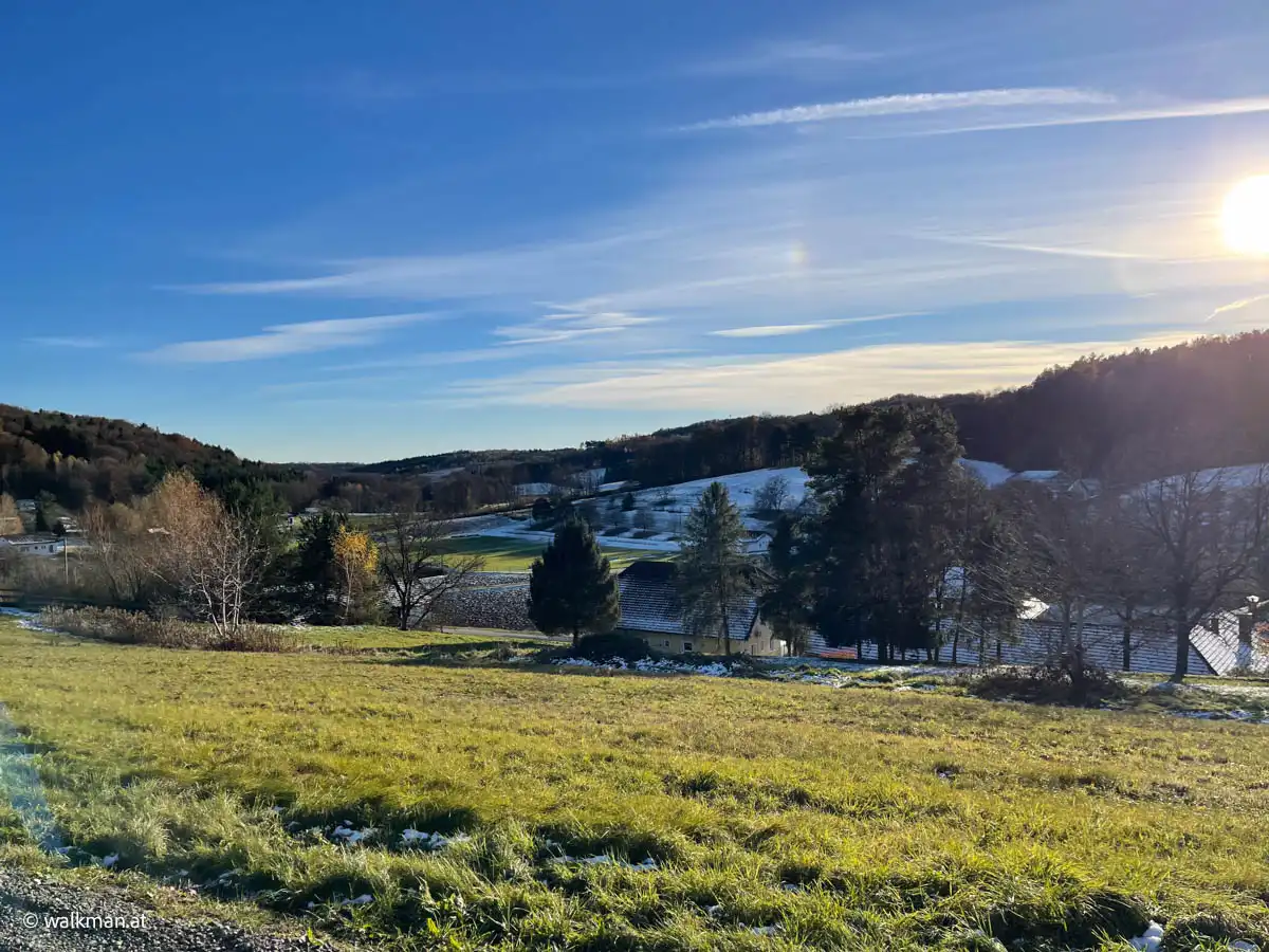 Start der Tour ist beim Gemeindeamt in Neustift. Vom Parkplatz hier weg, führt die Strecke zunächst an der Dorfstraße entlang nach hinten und nach ca. 400 Metern in die Gasse links hinein, zur Bundesstraße hinauf. Hier nun abermals links halten und an dieser, nach 1,15 Kilometern die Gasse bei der Dorfstube, rechts hinein.