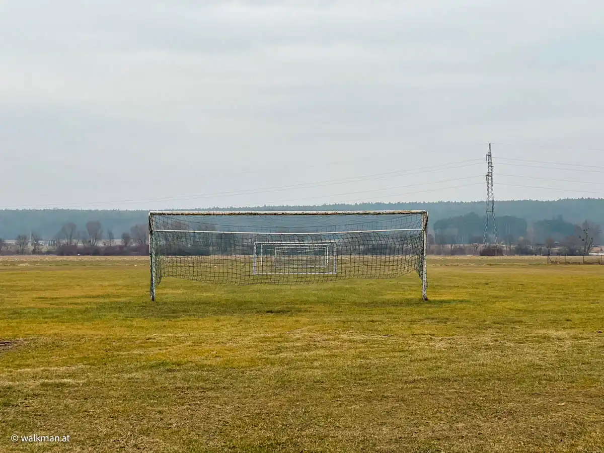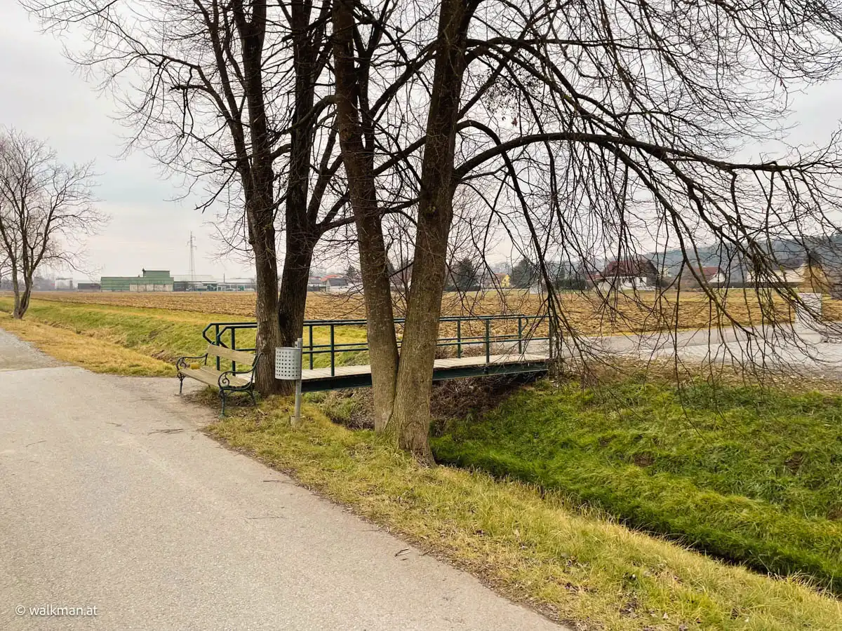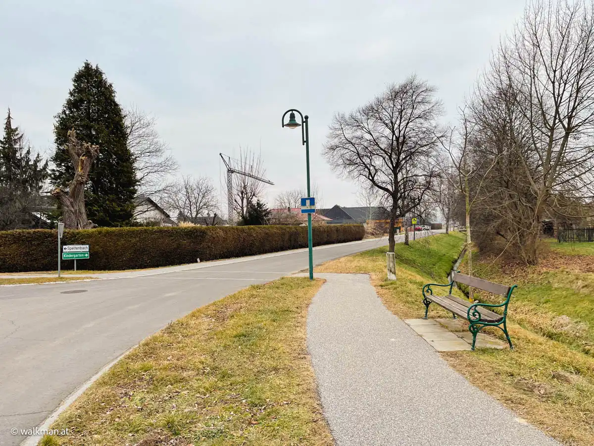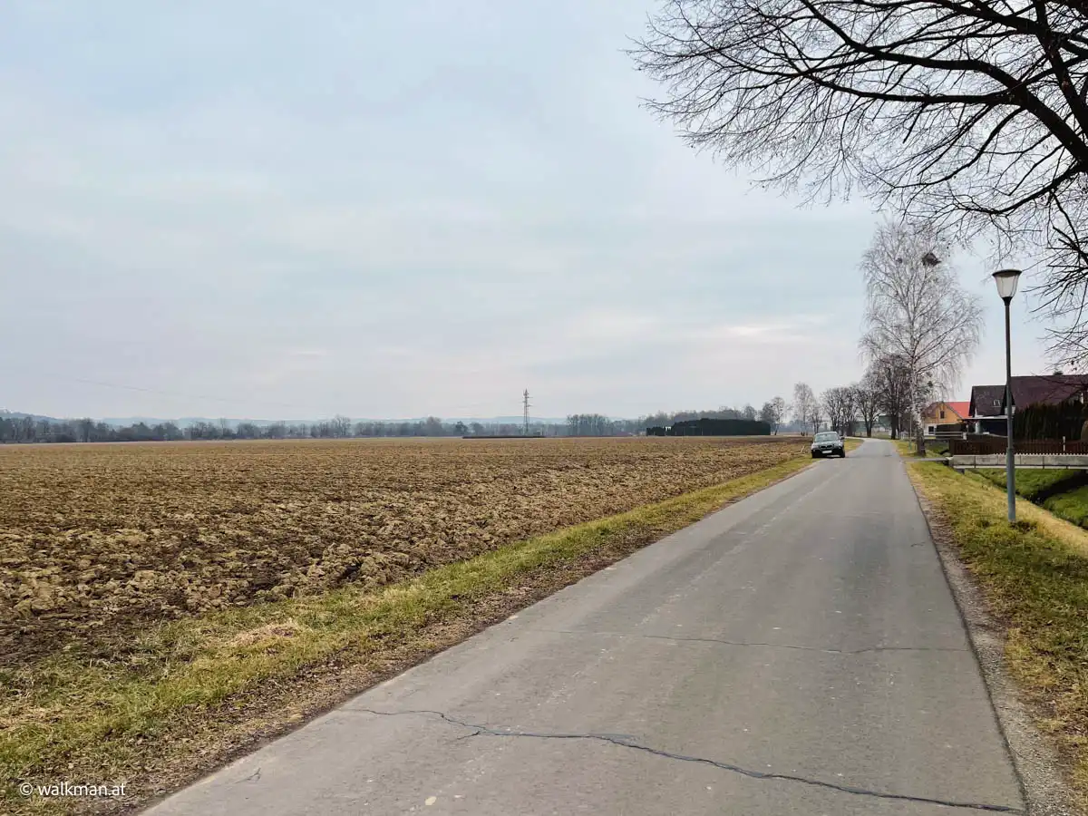 Nach dieser „Wissens-Erweiterung“ marschieren wir auf unserer heutigen Route weiter. Nun, an der Volksschule, am Kindergarten und am Sportplatz vorbei, wieder aus dem Ort hinaus. Hier spazieren wir nun linksseitig an einem, nicht näher benannten, Entlastungskanal entlang. Dem gegenüber befinden sich die Häuser einer Siedlung am Ortsrand, während sich zu unserer Linken das weite Land präsentiert. Wiesen, Felder und dahinter Waldstücke.