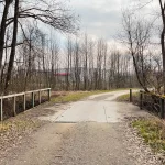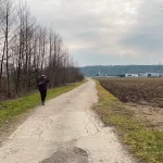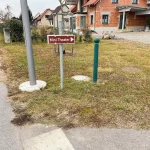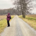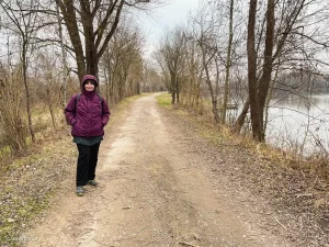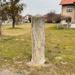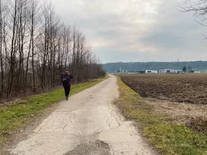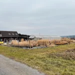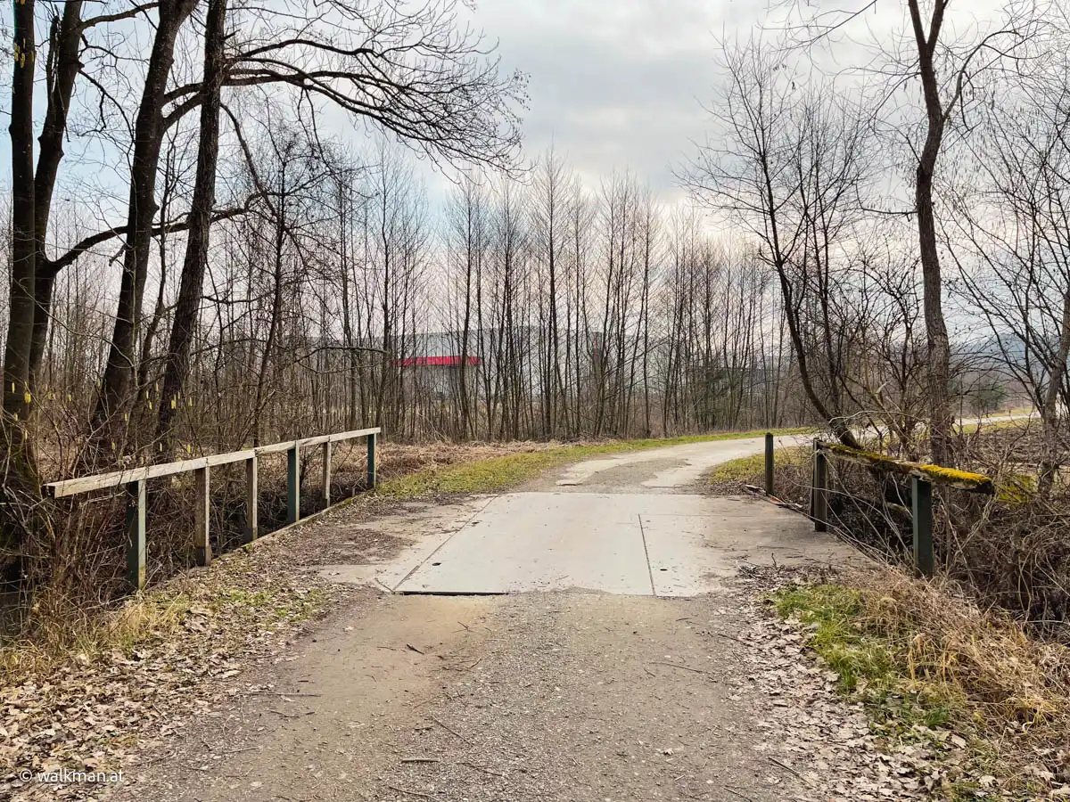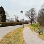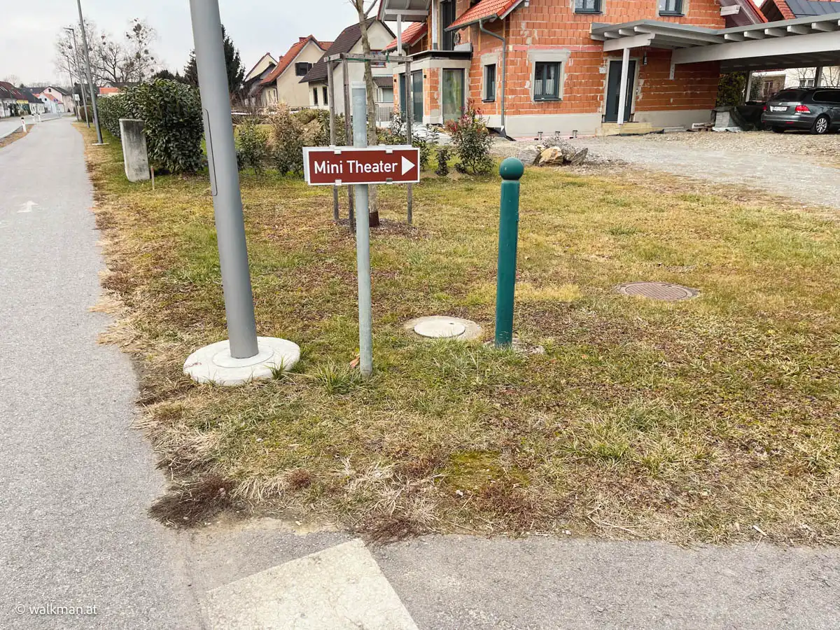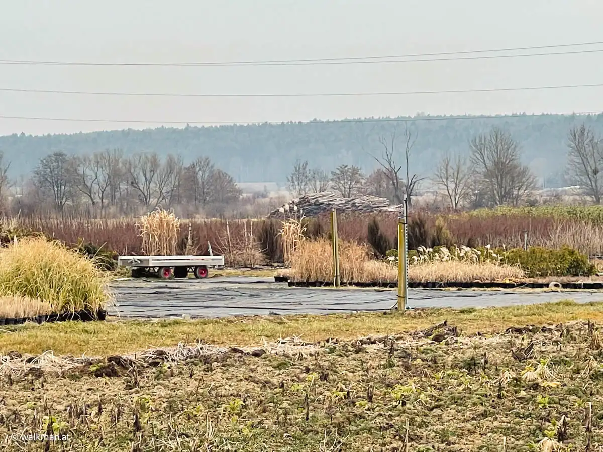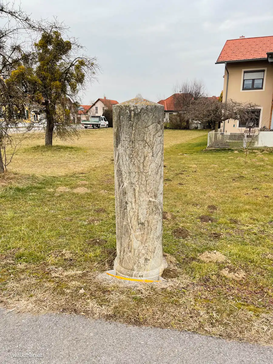 Nach dieser „Wissens-Erweiterung“ marschieren wir auf unserer heutigen Route weiter. Nun, an der Volksschule, am Kindergarten und am Sportplatz vorbei, wieder aus dem Ort hinaus. Hier spazieren wir nun linksseitig an einem, nicht näher benannten, Entlastungskanal entlang. Dem gegenüber befinden sich die Häuser einer Siedlung am Ortsrand, während sich zu unserer Linken das weite Land präsentiert. Wiesen, Felder und dahinter Waldstücke.