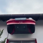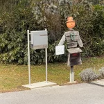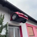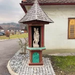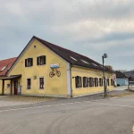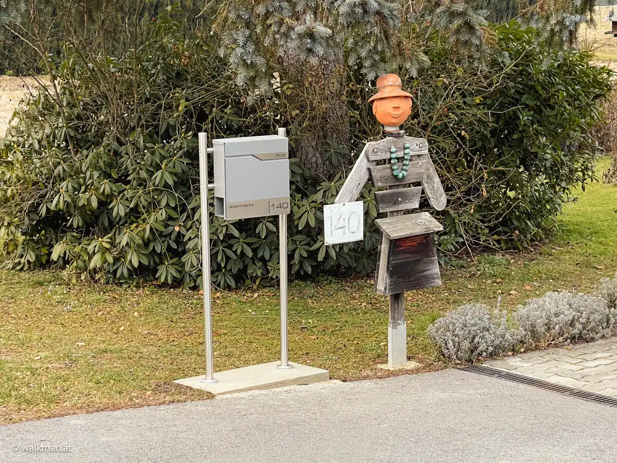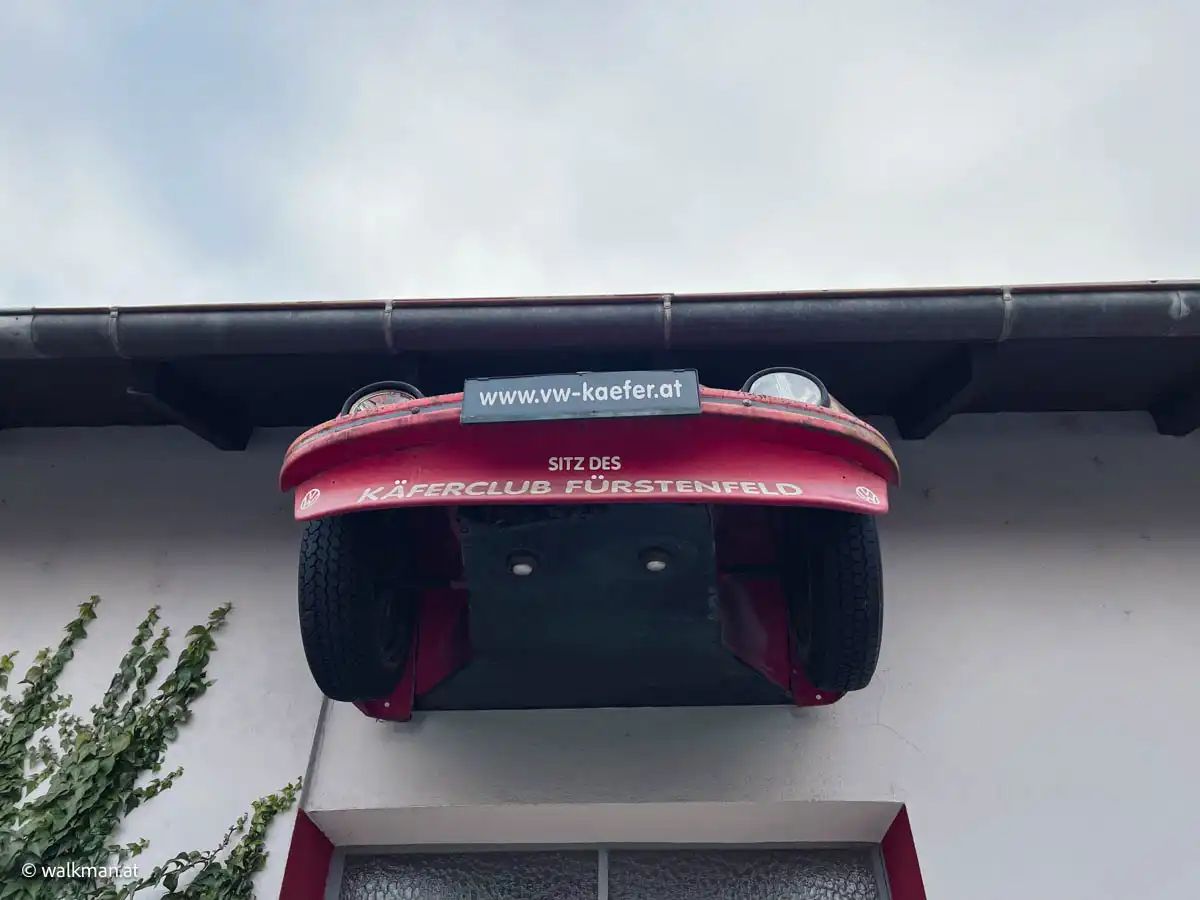 Vorbei an einer Kapelle, einem Bildstock und ortsansässigen kleineren und größeren Betrieben, „lacht“ uns kurze Zeit später, die Frontpartie eines alten VW-Käfers entgegen. Aber nicht wie vermutet, am Boden stehend als Teil eines kompletten Fahrzeuges. Nein. Hier ragt das Arrangement aus einer Hausfassade heraus. Montiert überkopf in über zwei Metern Höhe, direkt über einem Eingang.