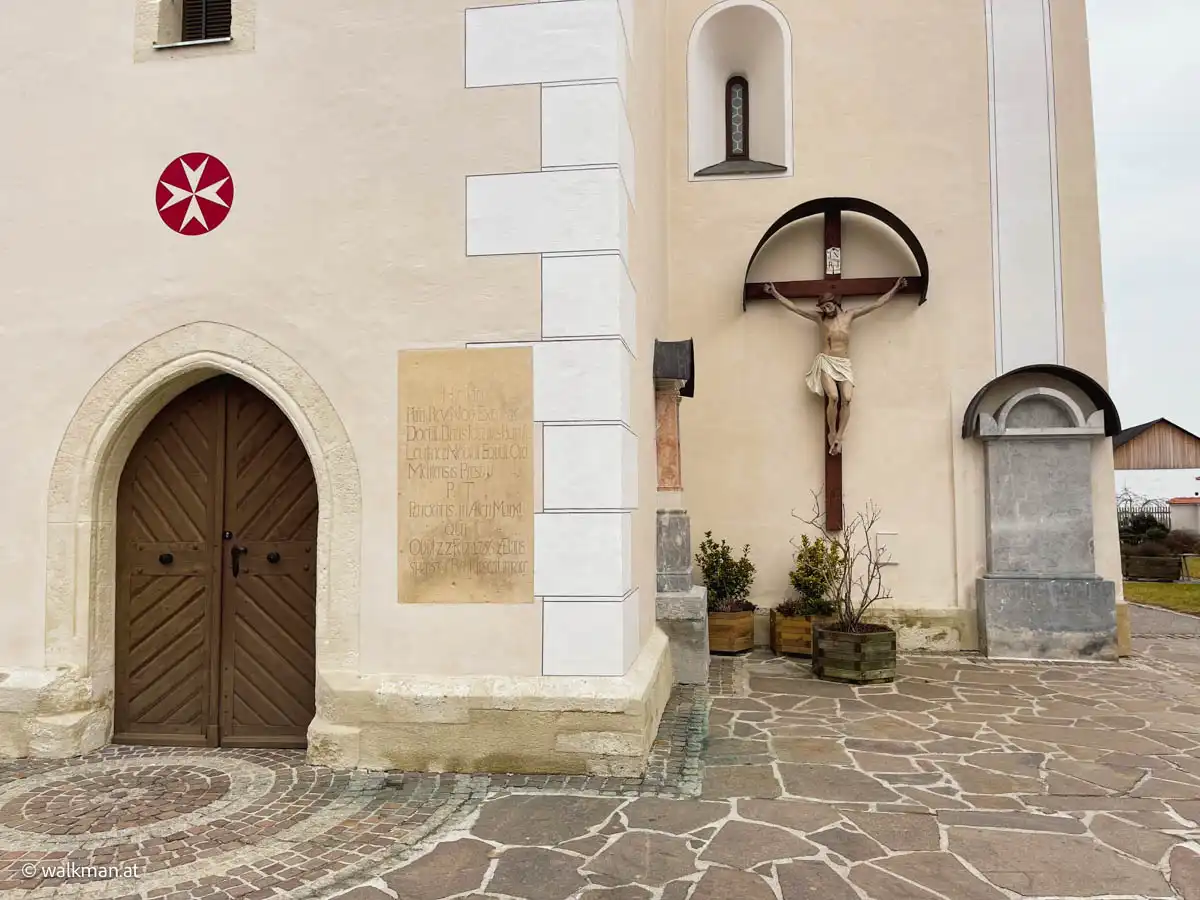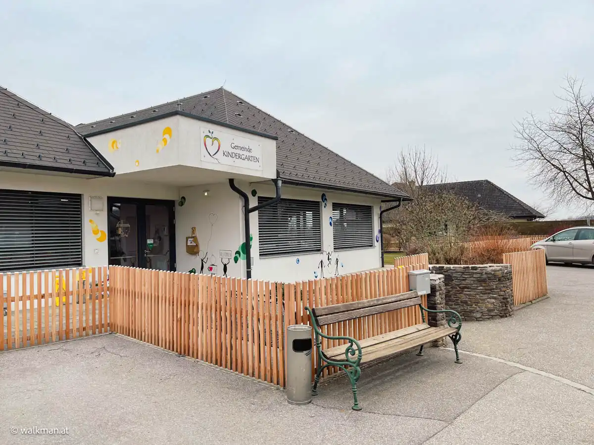 Nach einer knappen halben Stunde, oder bei Routen-Kilometer 1,6, erreichen wir dann den Hauptplatz von Altenmarkt. Sitzgelegenheiten, Kriegerdenkmal und die unvermeidliche Kirche, samt Kirchenwirt. Alles da. Gleich daneben auch die Volksschule und ein Gedenkstein. Viel zu gucken fürs Auge. Und wenn wir schon mal da sind, erkunden wir auch gleich die Kirche.