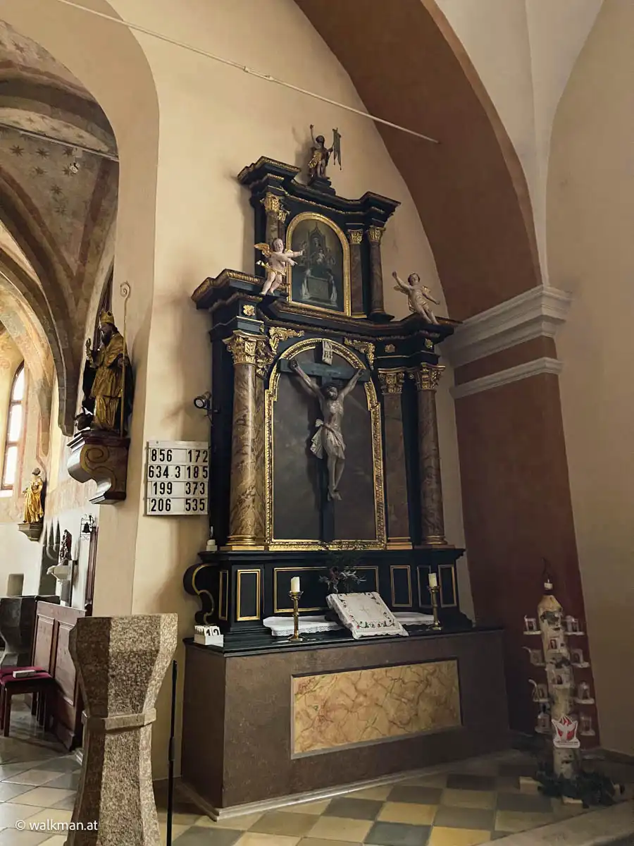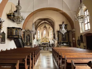 Hier wird geklotzt und nicht gekleckert. Vom imposanten Altar, samt mächtiger Kanzel und nachgebildeten Kreuzweg an den Wänden bis hin zur mächtigen Orgel, findet man hier alles, was eine „altehrwürdige“ Kirche ausmacht. Dazu auch noch alte Malereien an den Wänden und der kreuzgewölbten Decke.