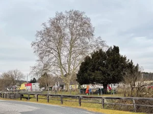 Ein Spielplatz, Rastmöglichkeiten und eine Pizzeria. Für uns heute alles ohne Belang. Aber wer hier im Sommer vorbei kommt, kann es sich unter dem Schatten einer riesigen Platane gemütlich machen.