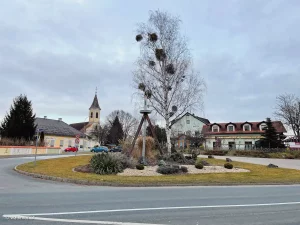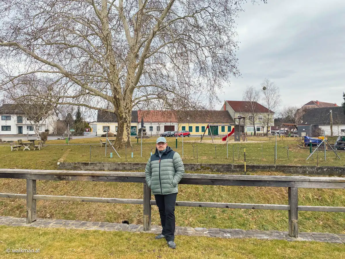Über die Hauptstraße drüber marschierten wir, schräg gegenüber, die Bachzeile hinein. Auf dieser führte unsere Route nun nach Norden. Vorbei an alten Bauernhäusern mit teilweise noch intakter Landwirtschaftsbetrieben, spazierten wir, schon kurze Zeit später, am Hauptplatz vorbei.