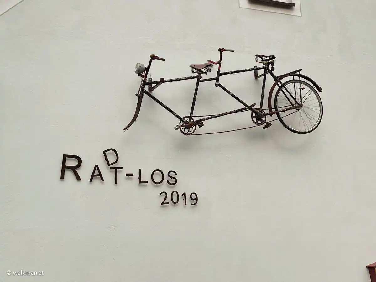 Wer malt sich schließlich das Logo der Fußball-EM an die Hausfassade? Solches haben wir auch hier entdeckt. Nebst einem Fahrrad, mit fehlendem Vorderrad, an der Fassade das verkündet, seit 2019 „rat(d)los“ zu sein. Für kurzweilige Unterhaltung beim Wandern ist hier also durchaus gesorgt.