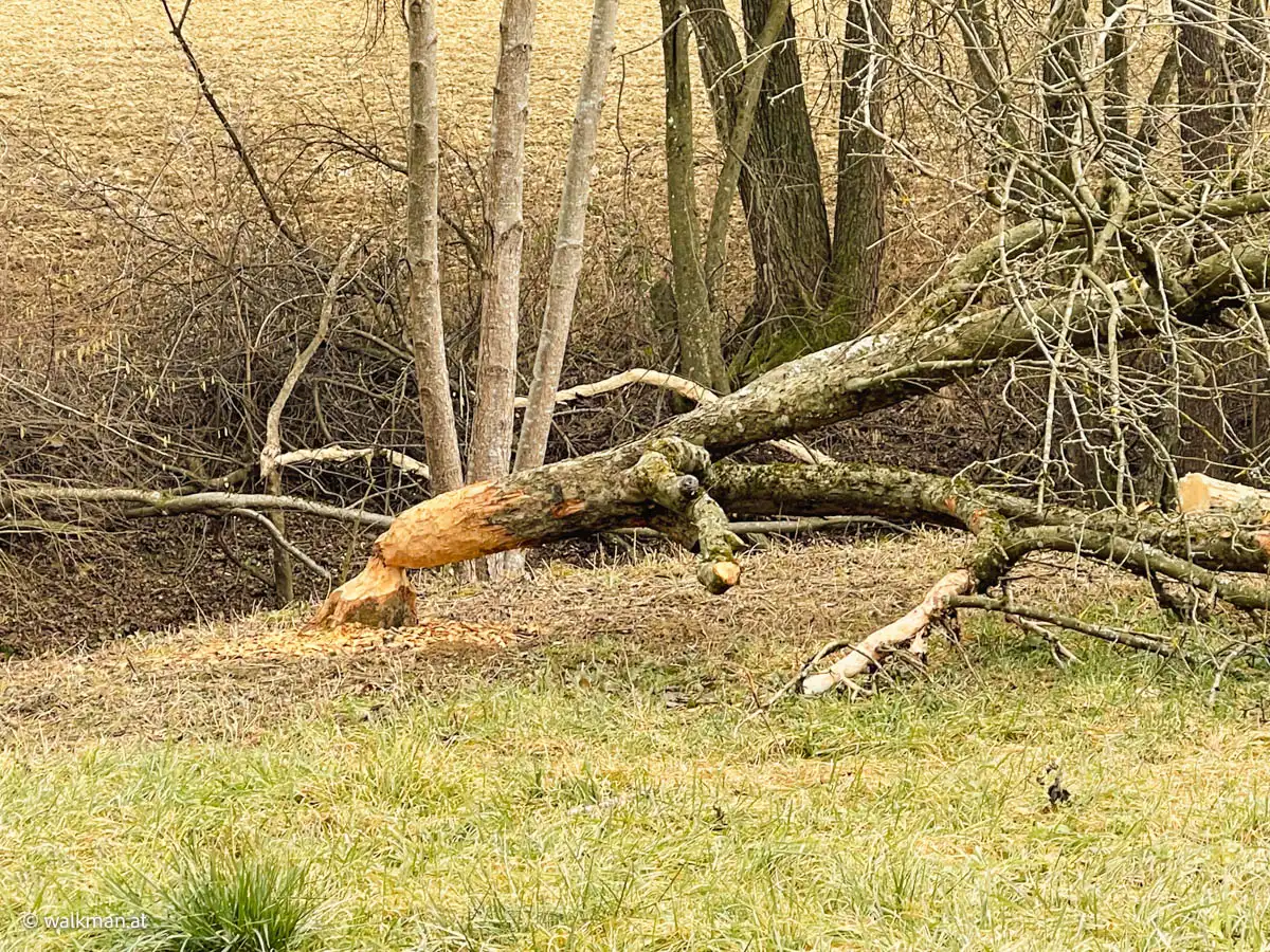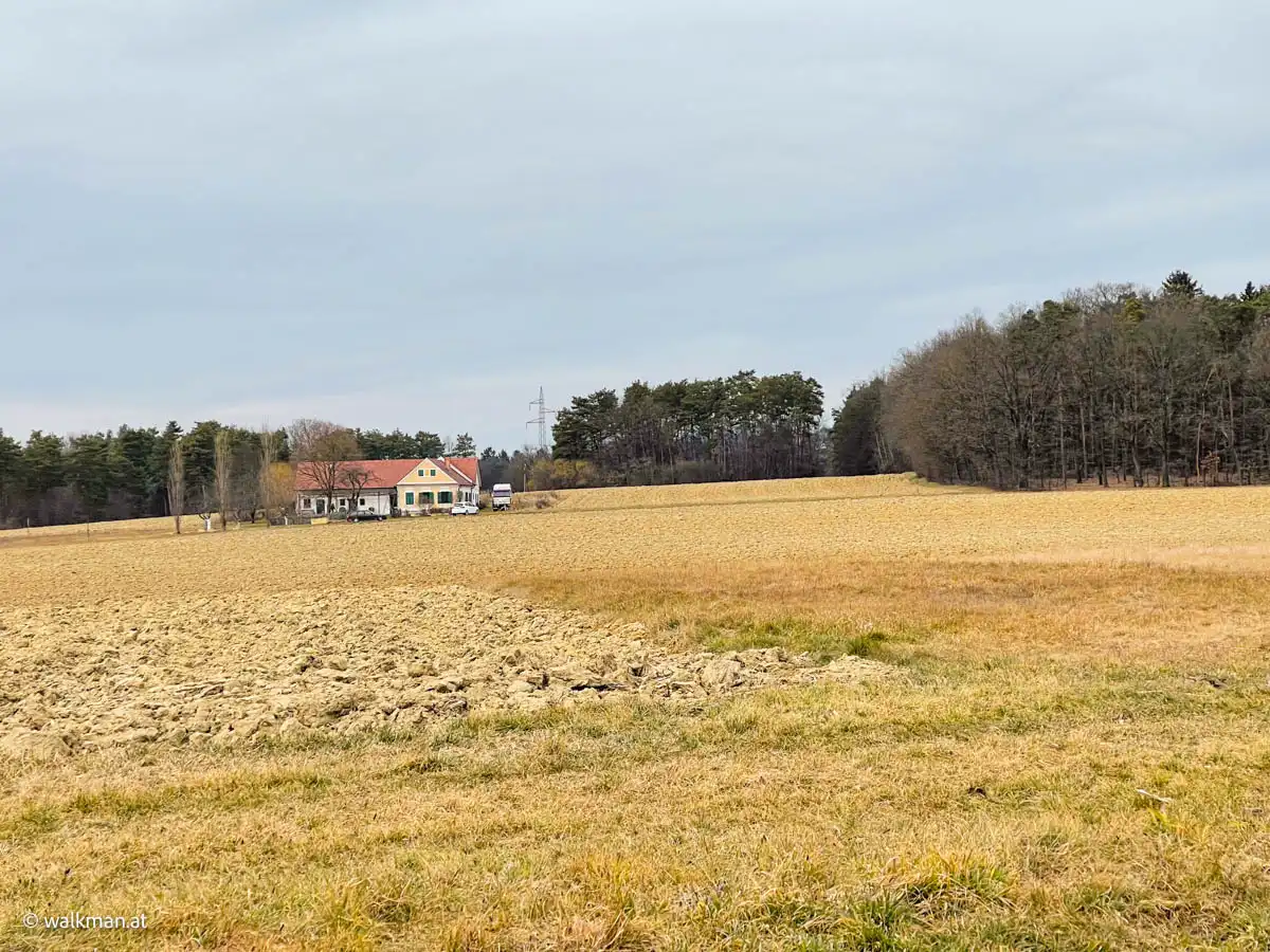 Nach 50 Minuten Wegzeit, oder 2,6 Kilometern Strecke, erreichen wir dann, mit dem Käferberg, den höchsten Punkt unserer heutigen Wanderung. Kalt ist es uns jetzt nicht mehr. Eher wohlig warm und ein wenig schwitzig unter den Jacken. So soll es sein. Und so kann es bleiben.