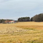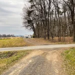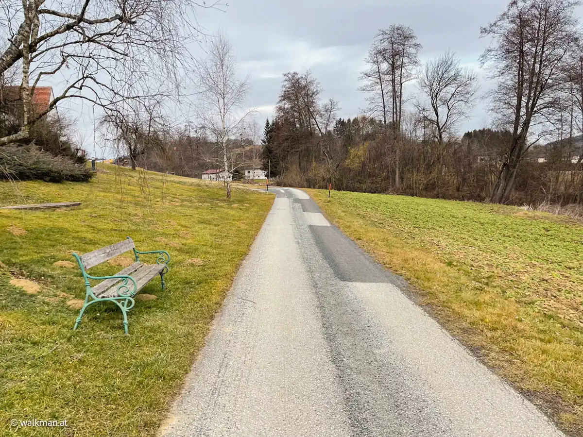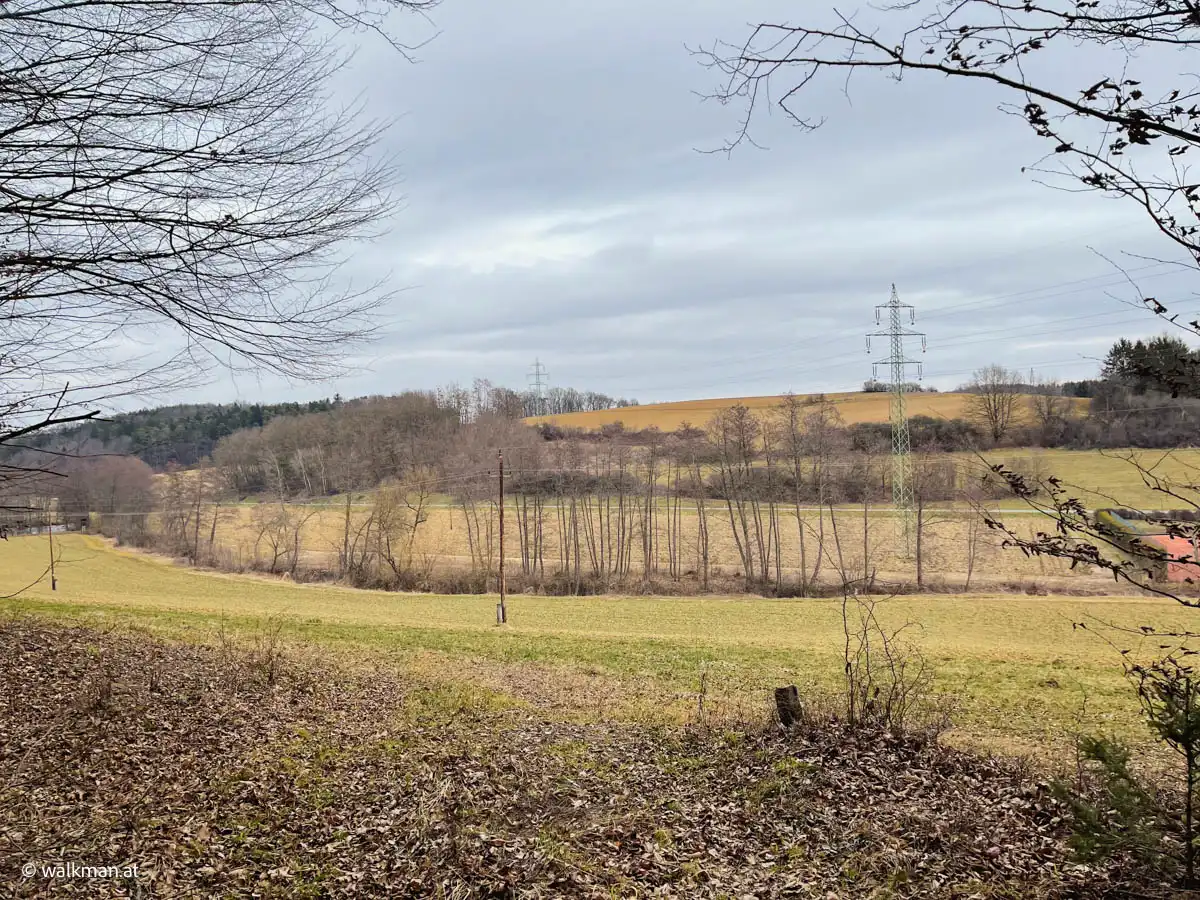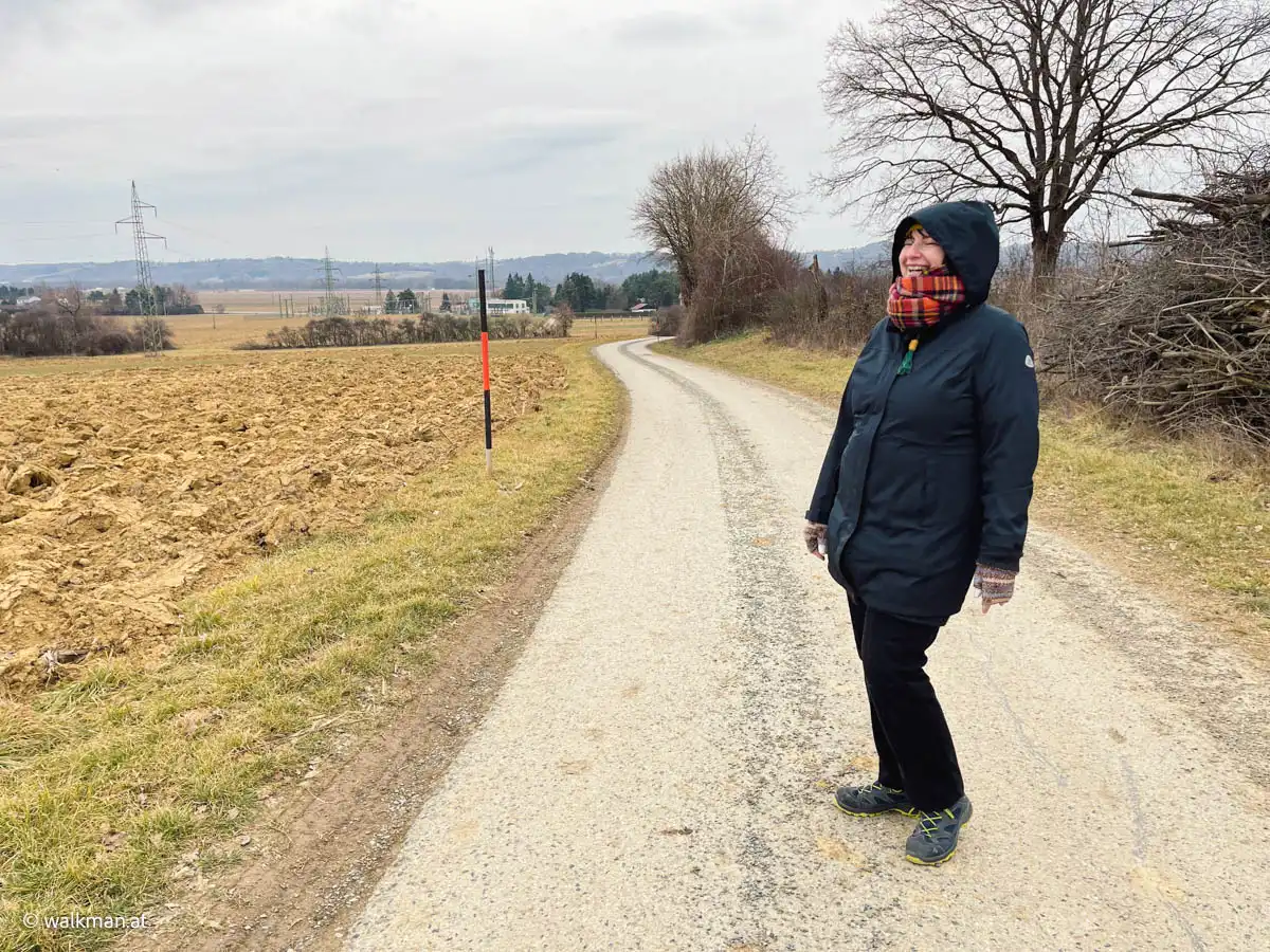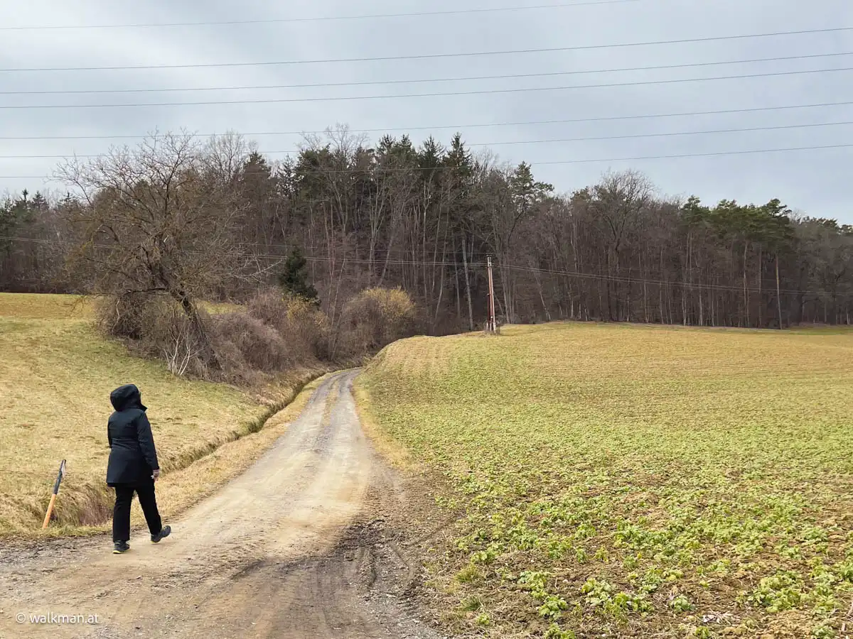 Nach etwa einem Kilometer marschieren wir aus dem Ort hinaus in die Natur. Hier geht es nun, nach wie vor weitgehend flach, übers Land. Links von uns Wald und Hügel. Und zu unserer Rechten sehen wir auf der Bundesstraße Autos nach Kukmirn fahren. Allerdings ohne den Nachbarort zu sehen. Da behindert dann wieder ein Hügel, am Ende des Tales, die Sicht auf diesen.