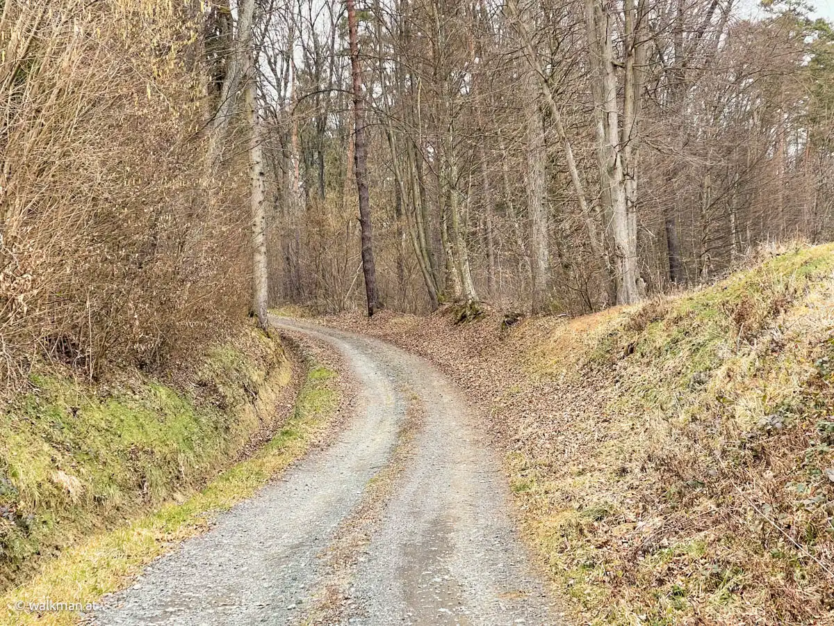 Nach den ersten beiden, angenehmen zwei Kilometern, geht es nun ein wenig ans „Eingemachte“. Unser „Kreislauf-in-Schwung-Bringungs-Abschnitt“ steht bevor. Auf einem kurvenreichen Schotterweg wandern wir nun ansprechend bergauf in den Wald hinein.